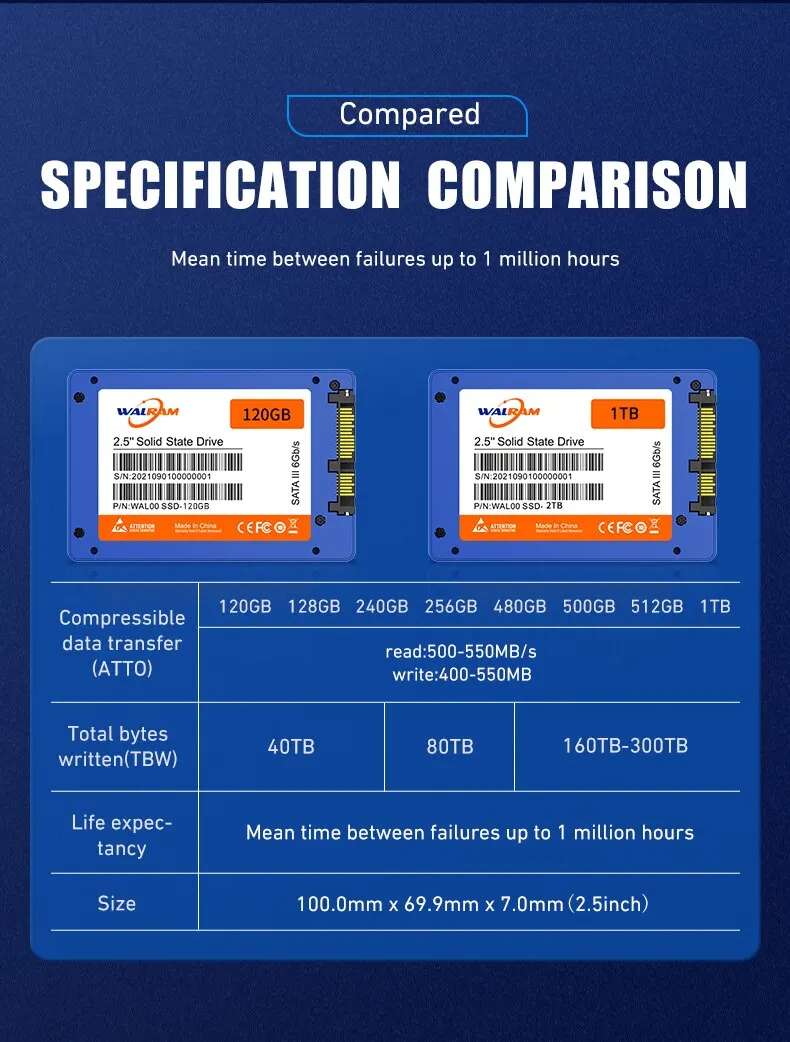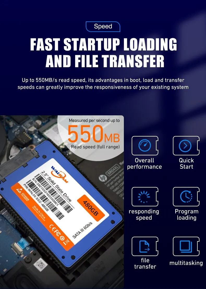 • Тип вспышки TLC NAND:Твердотельный накопитель Walram использует Тип вспышки TLC Nand, который обеспечивает высокую производительность и надежность.