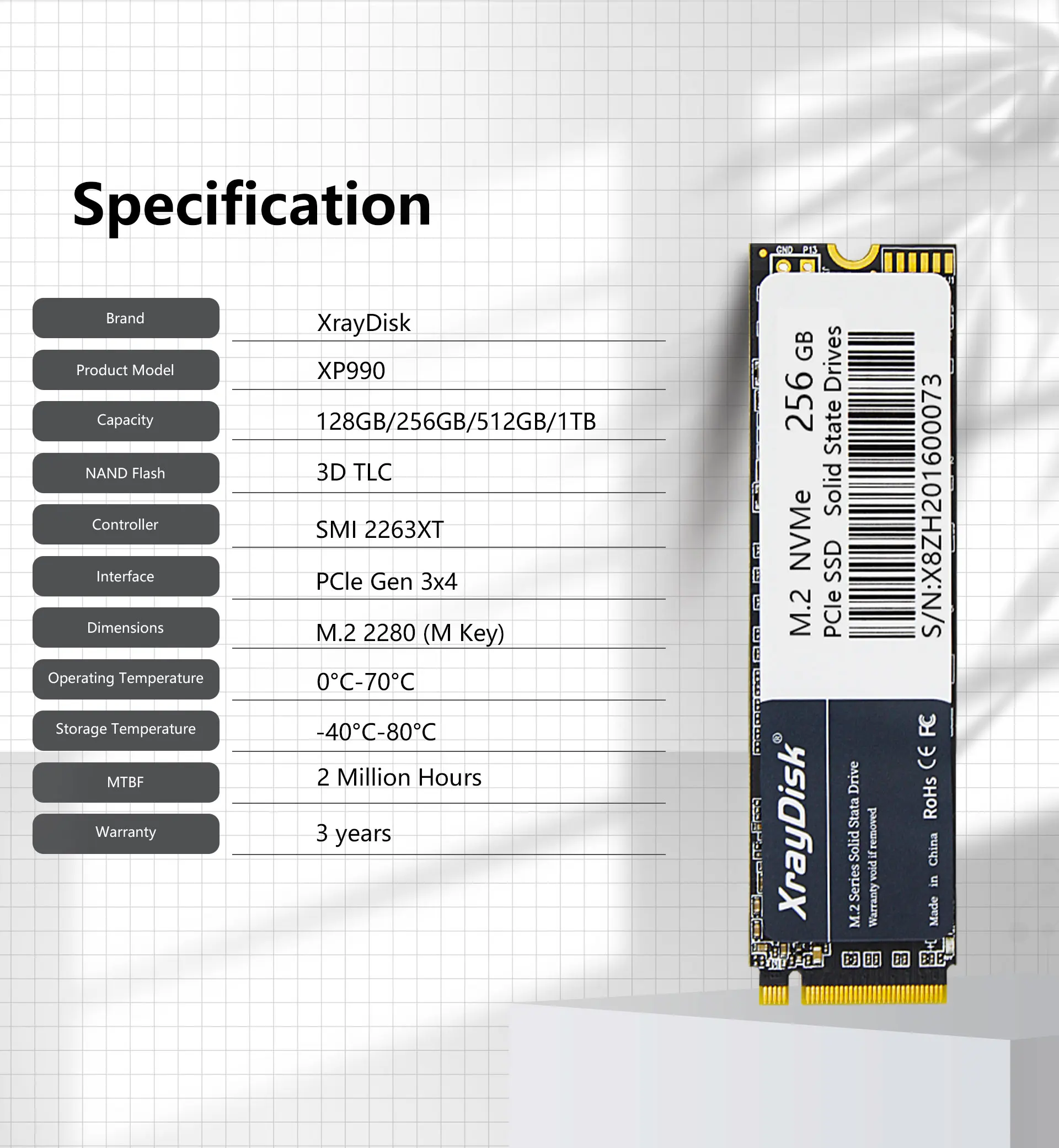 • Тип вспышки TLC NAND :Твердотельный накопитель XrayDisk M.2 использует флэш-память TLC Nand, которая обеспечивает высокую производительность и надежность.