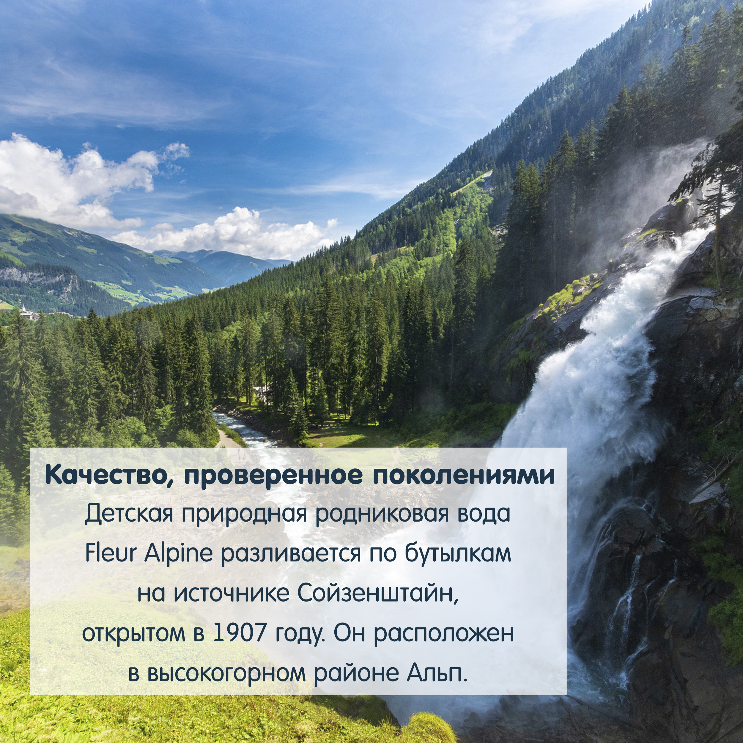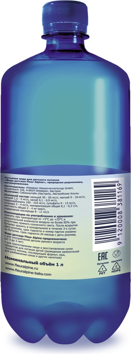 Детская вода Fleur Alpine имеет мягкий, нежный природный вкус, который обусловлен расположением источника Сойзенштайн в высокогорной части Австрийских Альп — в исторической природоохранной зоне.
