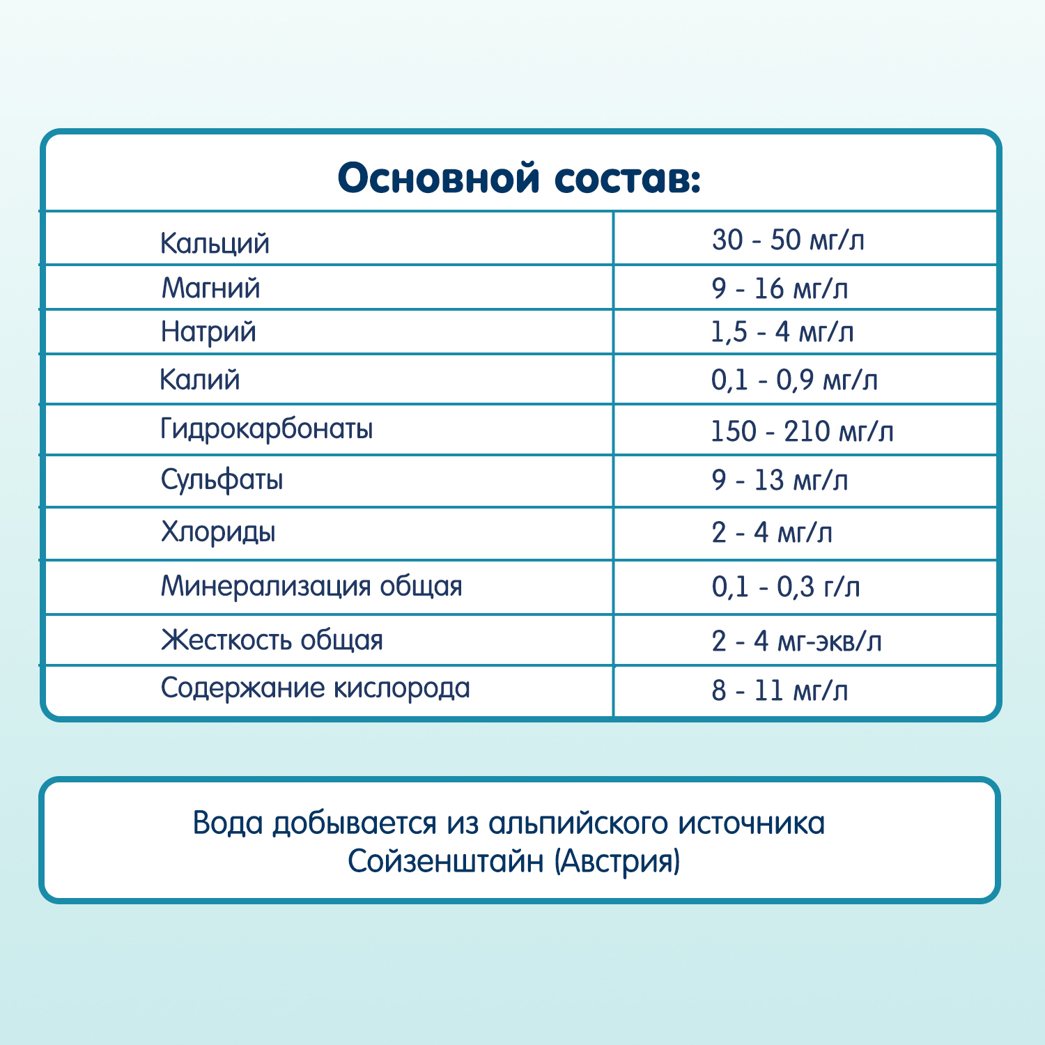 - Вода разливается в бутылки в высокогорной части Австрийских Альп в исторической природоохранной зоне непосредственно на источнике Сойзенштайн