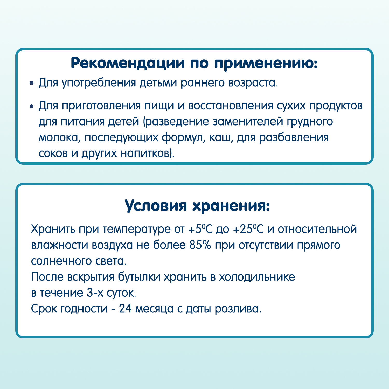 Срок годности - 24 месяца. Хранить при температуре от +5°С до +25°С и относительной влажности не более 85% при отсутствии прямого солнечного света. Для детского питания после вскрытия хранить в холодильнике и использовать в течение трех суток.