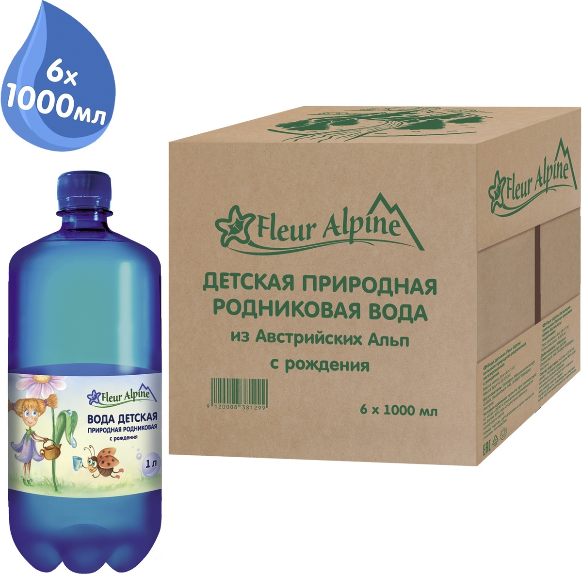 Вода детская природная родниковая, негазированная Fleur Alpine, с рождения, 6 шт по 1 л