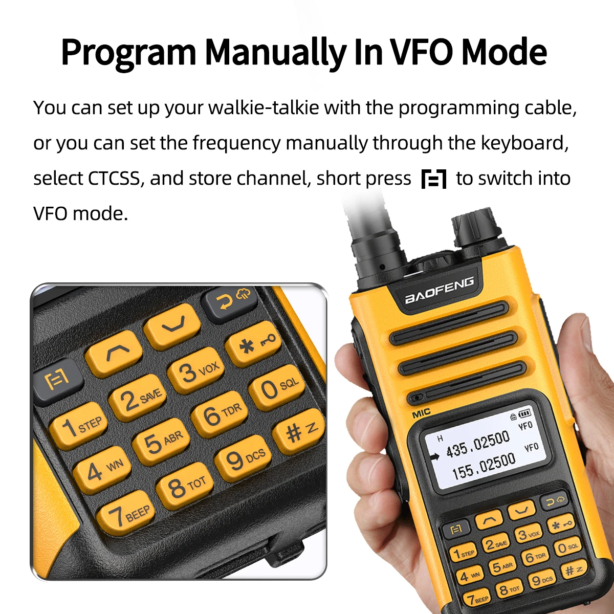 Помимо программирования радио с помощью компьютерного программного обеспечения, пользователи также могут использовать клавиатуру для программирования большинства настроек в меню, например, добавления/удаления канала памяти, добавление/удаление канала из списка сканирования, настройка уровней VOX/шумоподавления/энергосбережения и т. д.