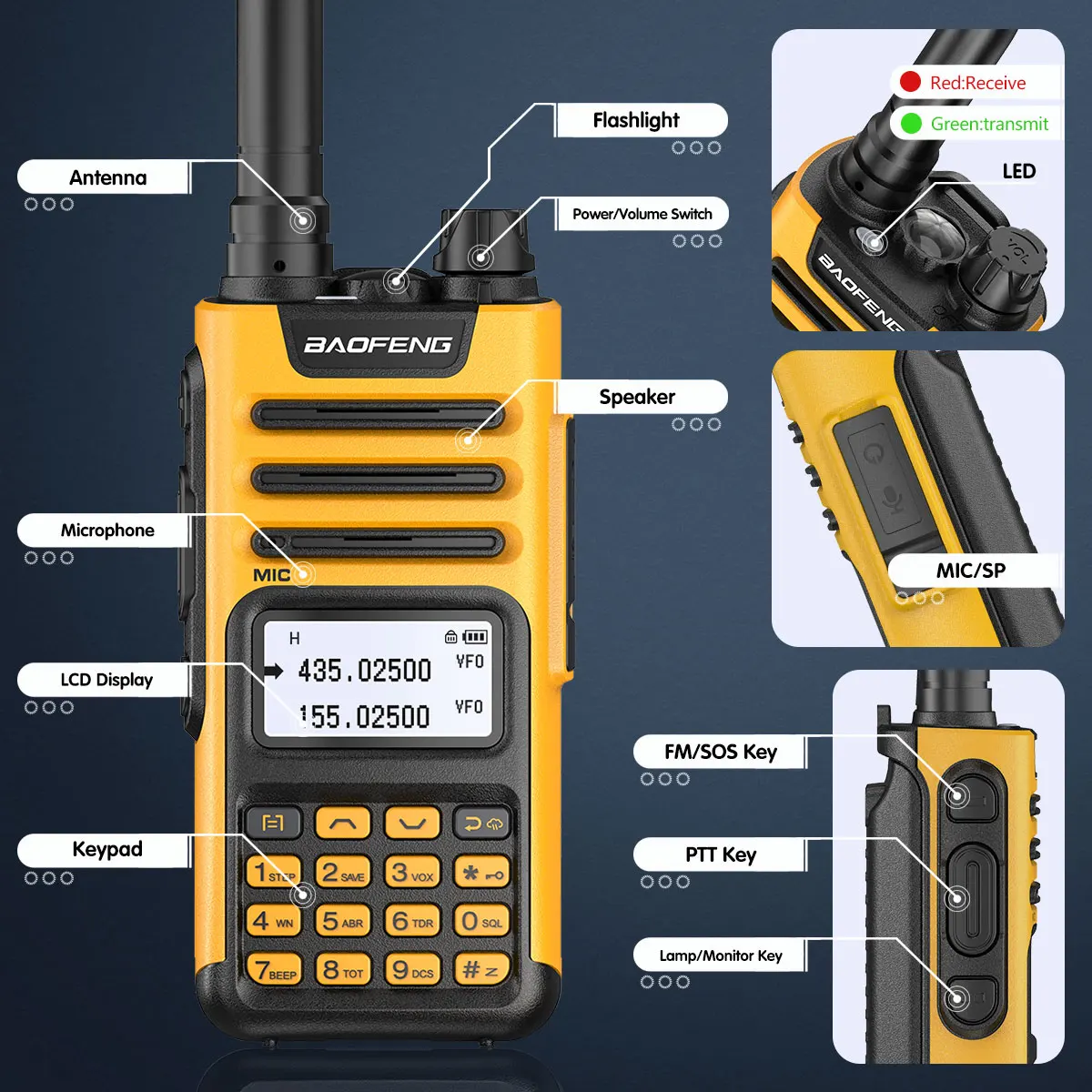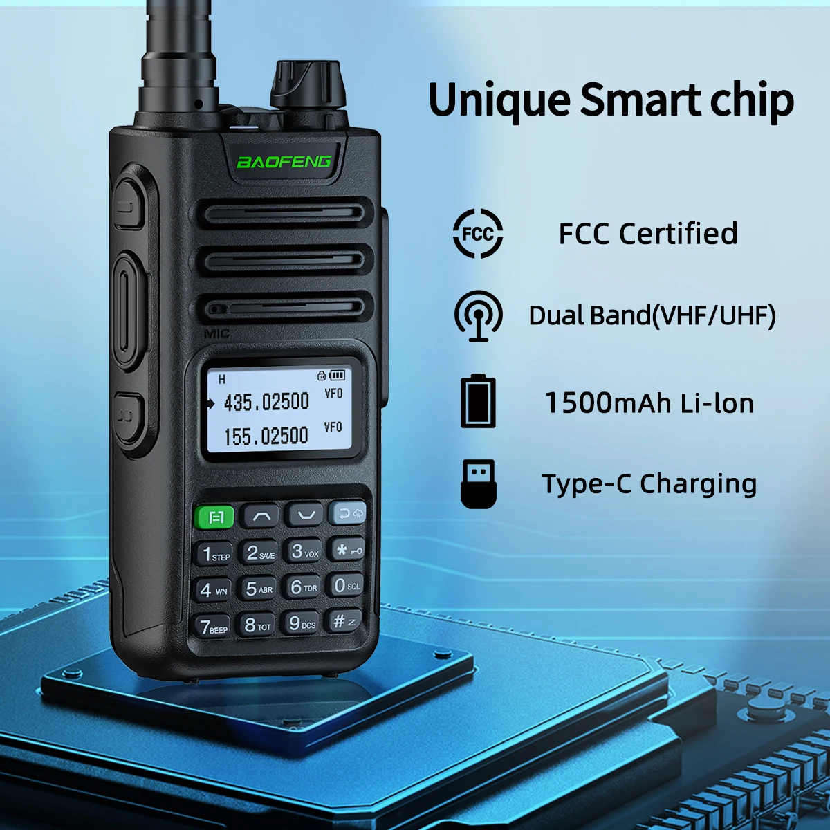 Канал памяти 999; CTCSS/DCS; Режим VOX для громкой связи; Независимая работа диапазона A/B; Двухдиапазонный; двойной дисплей; двойная резервная Автоматическая блокировка клавиатуры.