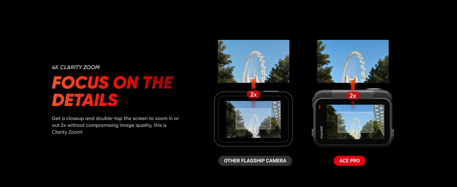 • Флагманский датчик 1/1,3 дюйма и 5-нм чип AI: оснащенный более крупным датчиком премиум-класса, Ace Pro захватывает больше света с радикальным улучшением качества изображения. Ace Pro также является первой экшн-камерой с мощным 5-нм чипом AI, максимизируя возможности сенсора и усиливая яркость изображения при слабом освещении с уменьшенным шумом. И все благодаря силе ИИ.