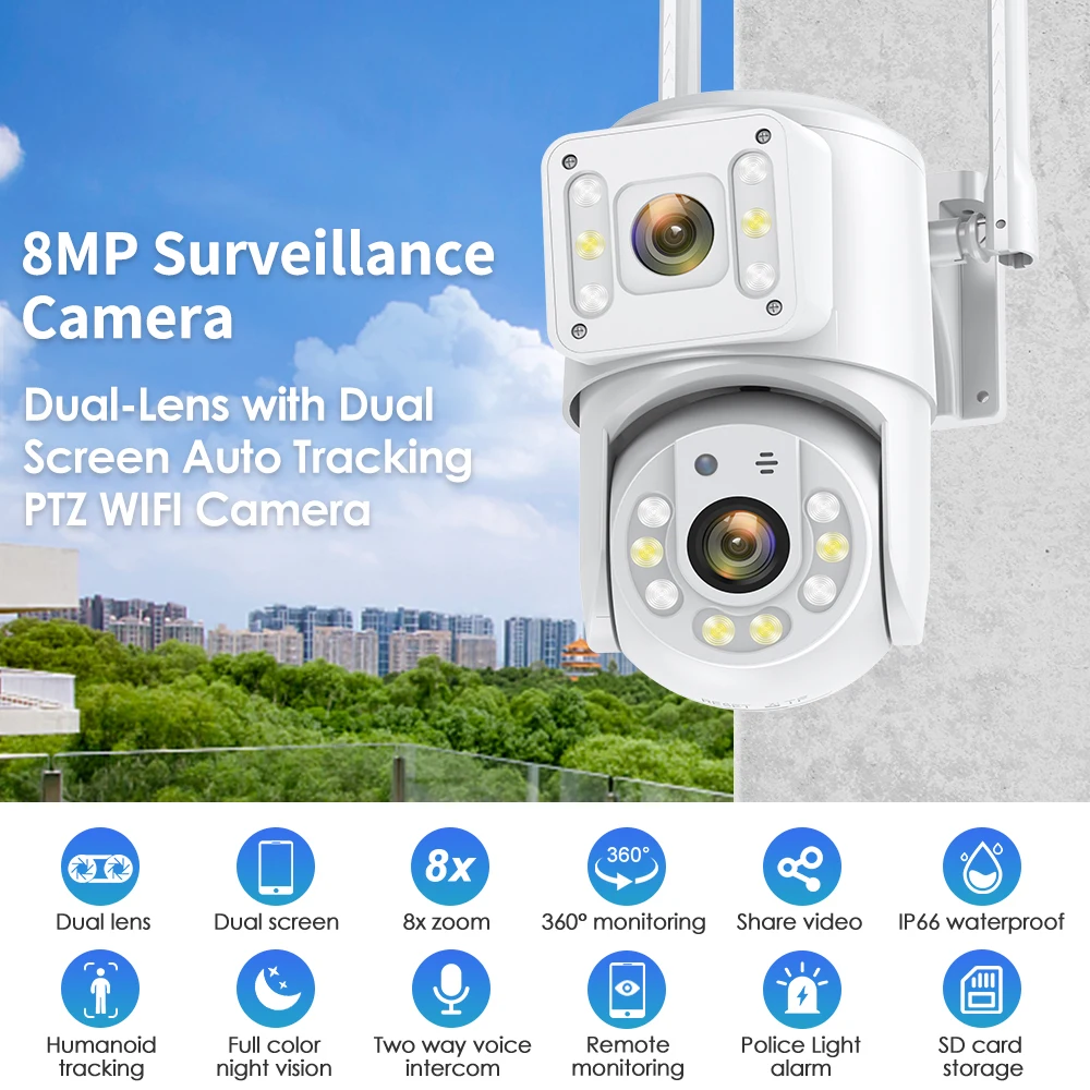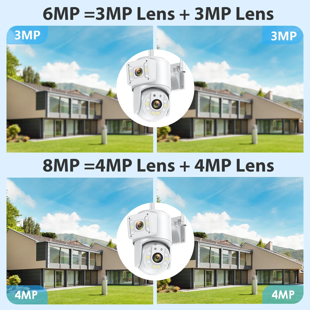 Камера наблюдения имеет конструкцию с двумя объективами с объективами 3,6 мм и 8 мм. Он включает в себя широкоугольный объектив 4 мм для наблюдения с близкого расстояния и с широким обзором, а также телеобъектив 8 мм. Пользователи могут переключаться между различными объективами для достижения различных визуальных перспектив по мере необходимости.