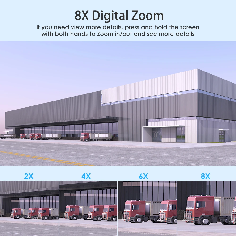 Камера наблюдения может похвастаться впечатляющими функциями, в том числе мощным 8-кратным цифровым зумом. Всякий раз, когда пользователям нужно увидеть больше деталей, они могут просто использовать жест зажима двумя пальцами на экране, чтобы легко увеличивать или уменьшать изображение, позволяя им получать более четкие и подробные визуальные эффекты. Эта удобная функция позволяет пользователям с точностью наблюдать за конкретными областями, фиксируя даже малейшие движения или детали. Независимо от того, используется ли он для мониторинга безопасности или других целей, функция 8-кратного цифрового зума и масштабирования на основе жестов камеры наблюдения предоставляет пользователям улучшенное визуальное восприятие и более широкий охват мониторинга.