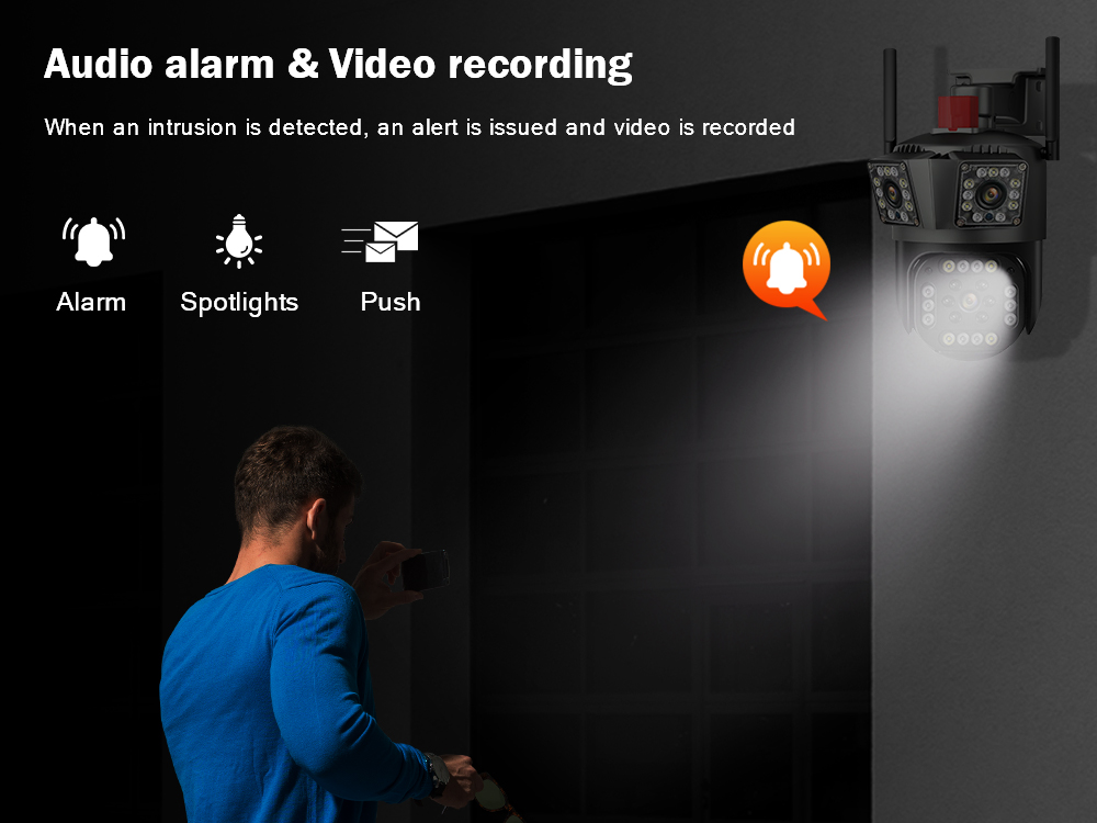 * При обнаружении движения человека камера будет отслеживать движение человеческого тела, излучать свет и отправлять сигналы тревоги в реальном времени.