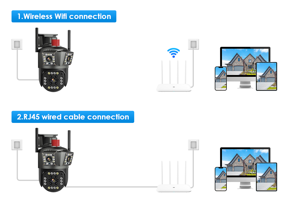 -Питание от адаптера DC12V, вы можете подключить камеру к сети Wi-Fi. Вы можете настроить Wi-Fi подключение камеры или поиск по локальной сети с помощью сетевого кабеля, подключенного к маршрутизатору, работать только с 2,4 ГWi-Fi (не поддерживает 5G)