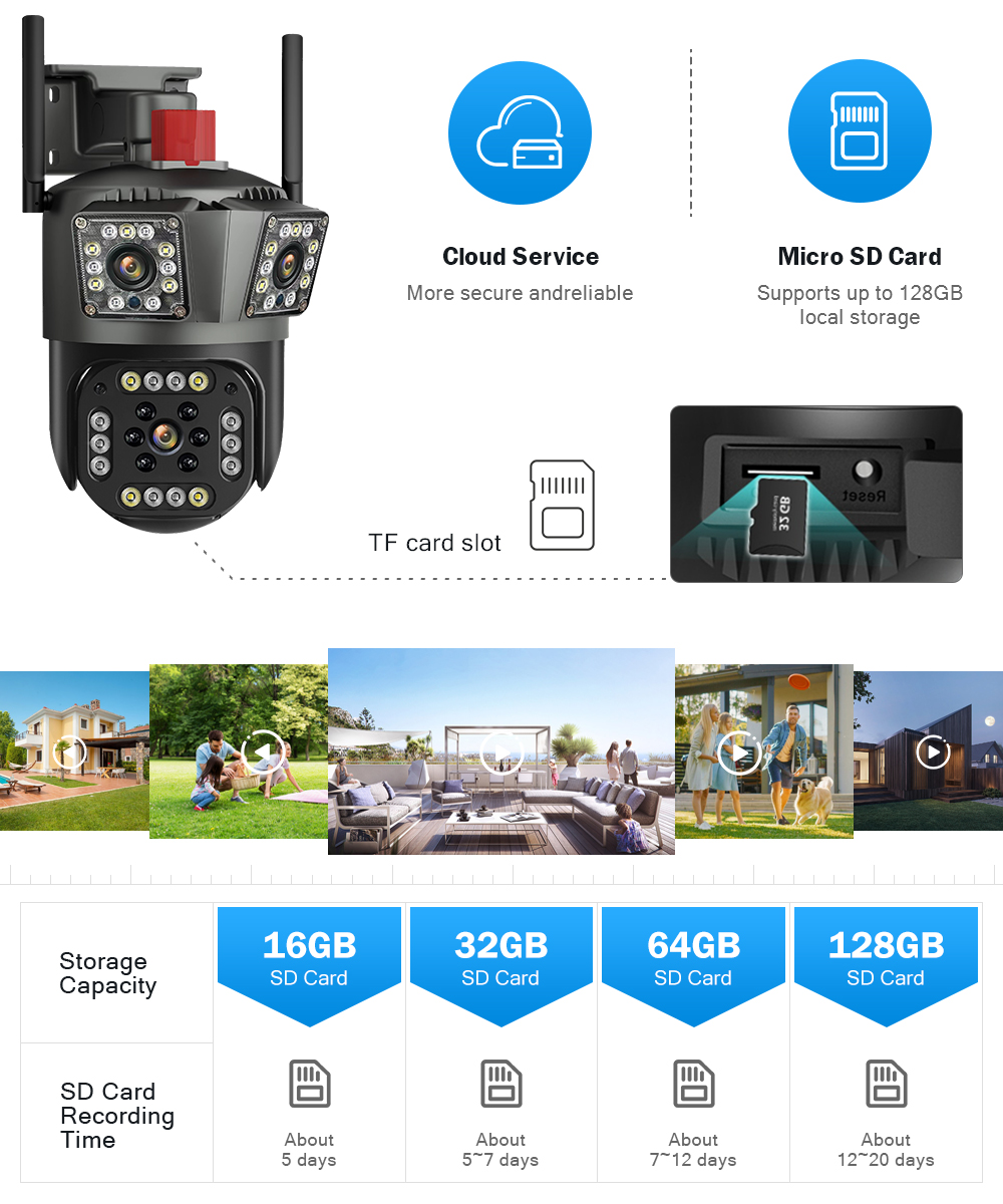 * Вставьте TF-карту объемом до 128 ГБ (TF можно выбрать по мере необходимости), что поможет вам сохранить видео, которое вы не хотите удалять.