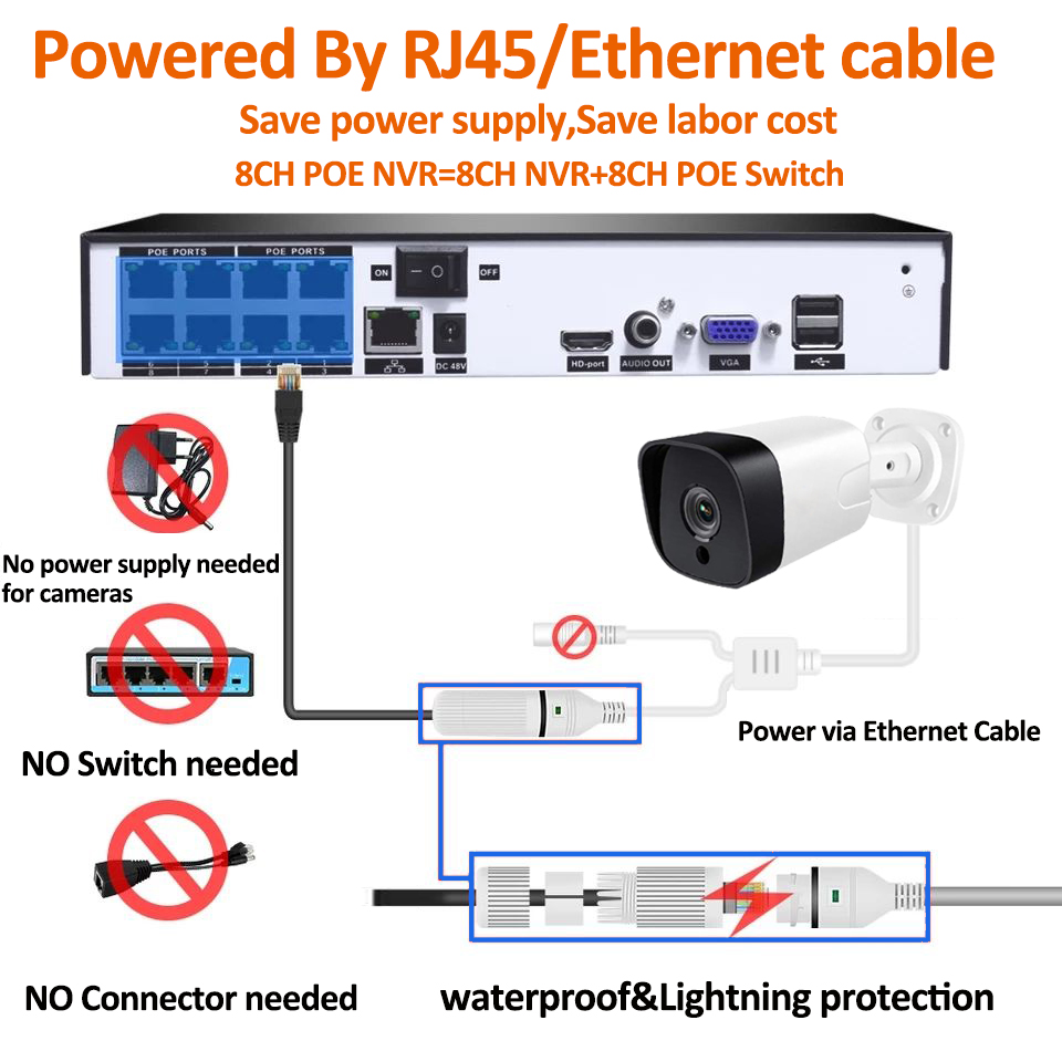 Power Over Ethernet означает, что IP-камеры подключаются к сетевому видеорегистраторУ с помощью кабеля Ethernet, который передает как данные, так и питание, нет необходимости подключать кабель питания, нет необходимости подключаться к Swither, более низкий риск утечки электричества и простота настройки. Экономьте время установки и сокращайте расходы.