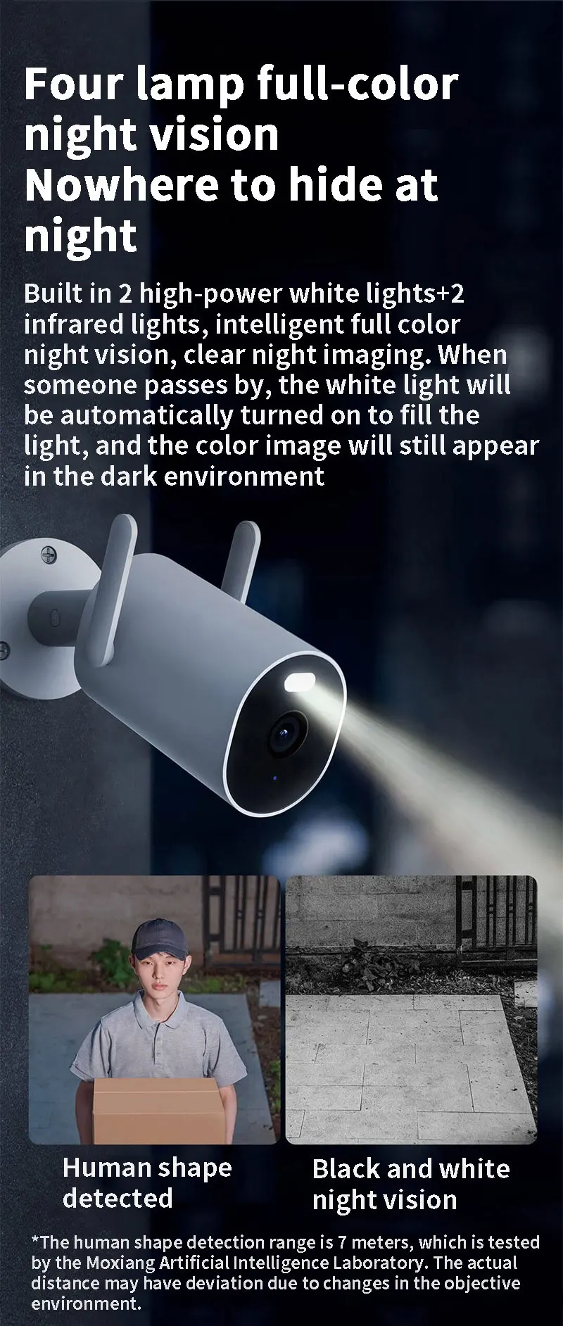 Встроенные 2 мощных белых лампы + 2 инфракрасных лампы, интеллектуальное полноцветное ночное видение, четкое ночное освещение. Когда кто-то проходит мимо, белый свет автоматически включается, чтобы заполнить свет, и цветное изображение по-прежнему будет отображаться в темноте.