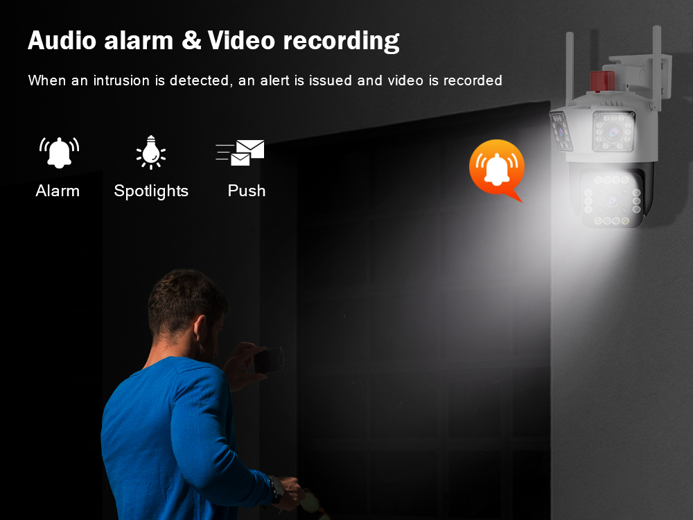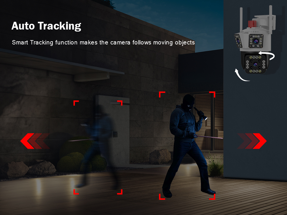 * При обнаружении движения человека камера будет отслеживать движение человеческого тела, излучать свет и отправлять сигналы тревоги в реальном времени.