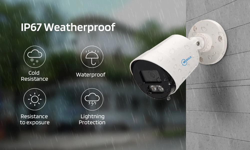 Камера наблюдения MOVOLS имеет прочный алюминиевый корпус и корпус, сВодонепроницаемость IP66. Таким образом, вы можете свободно устанавливать его на открытом воздухе, например, в гараже, на заднем дворе или в любом другом месте. Он может выдерживать суровые погодные условия, включая дождь, снег, сильный холод и тепло.