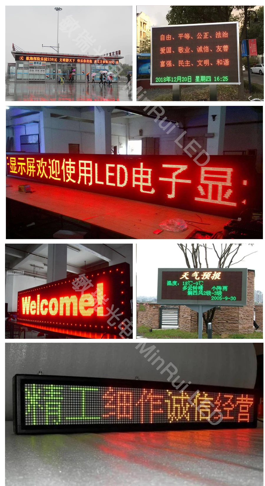 P10m outdoor single color LED display screen can display information such as all kinds of graphics and text. Surface smooth, uniform and display, luminous brightness is good, clear display effect is stable, with a dozen cycle changes. Use remote serial communication, can be run offline, with functions of power-fail protection. Are all made of high brightness LED light-emitting diode and imported components assembly production. With high brightness, wide visual, long life, light weight, modular structure, easy installation, easy maintenance, etc.