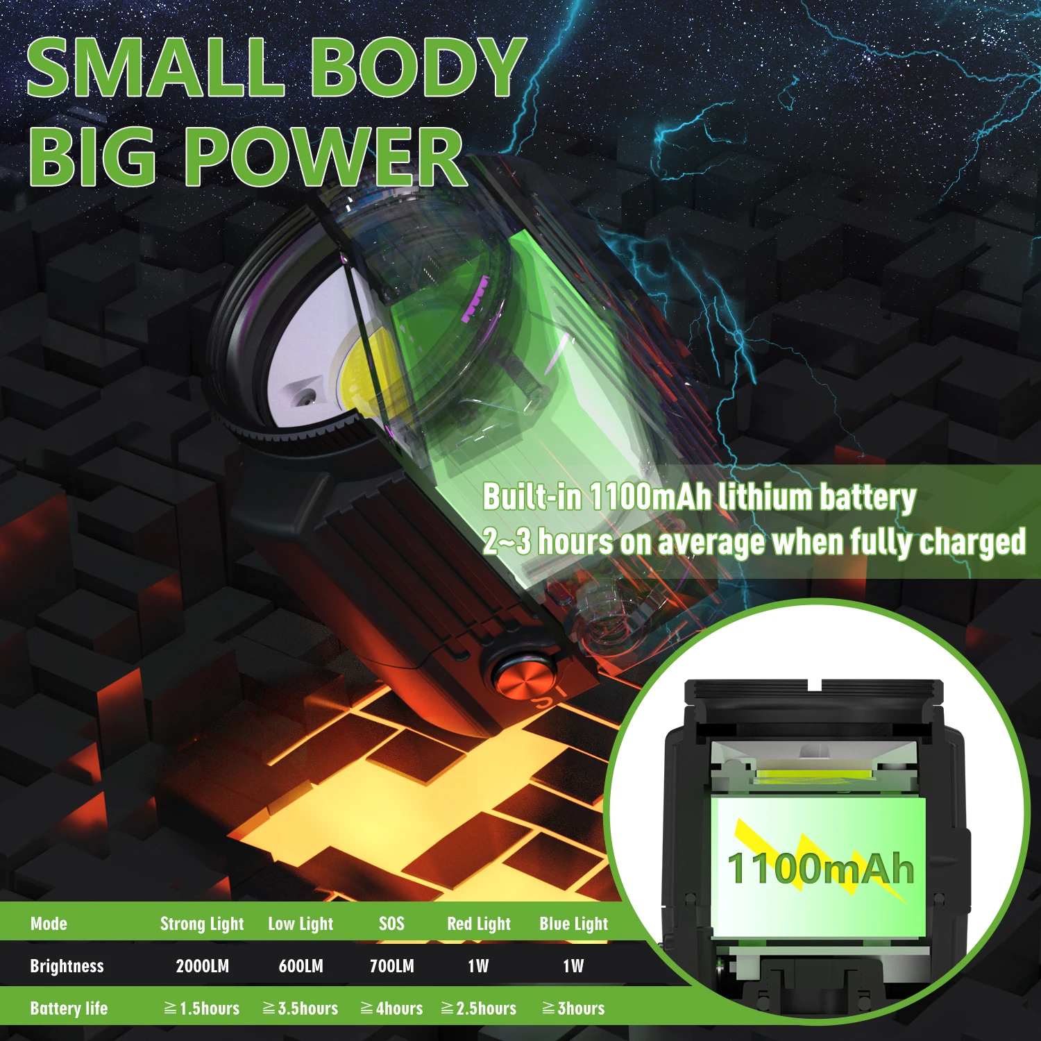 Mode White strong 2000LM Low 600Lm SOS 700 Lm RED Blue