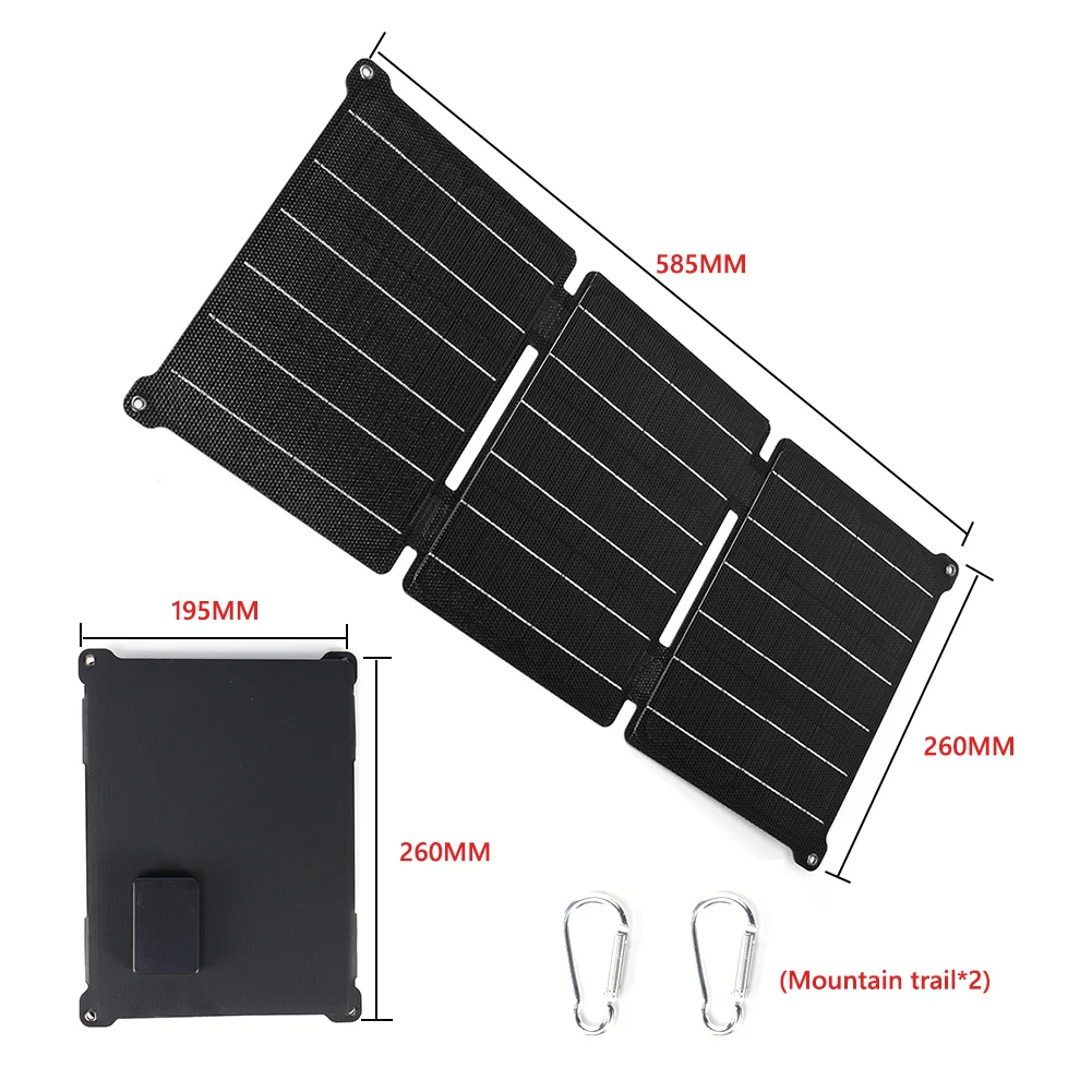 4. Складной, портативный и практичный:Это зарядное устройство на солнечной панели легкое и имеет 2 слоя складывания. В полном сложенном виде Размер 260*195 мм. Также поставляется с 2 карабинами, это действительно удобно для Путешествий, Походов, Кемпинга и других мероприятий на свежем воздухе.