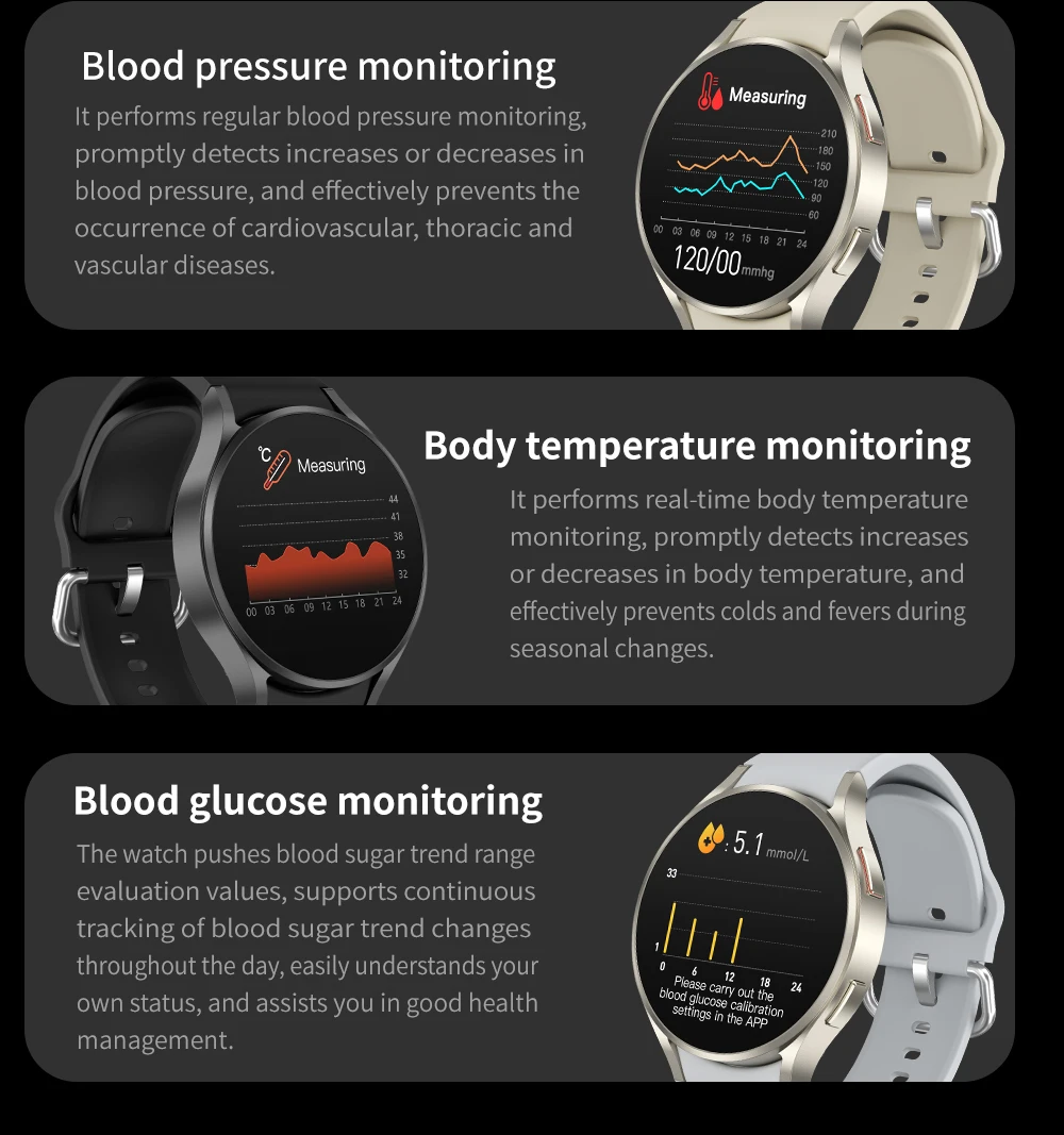 ➤Обнаружение здоровья (Артериальное давление, уровень сахара в крови, температура, частота сердечных сокращений, кислород крови, напоминание о сидячем положении, мониторинг сна, автоматический мониторинг сердечного ритма и т. Д.)
