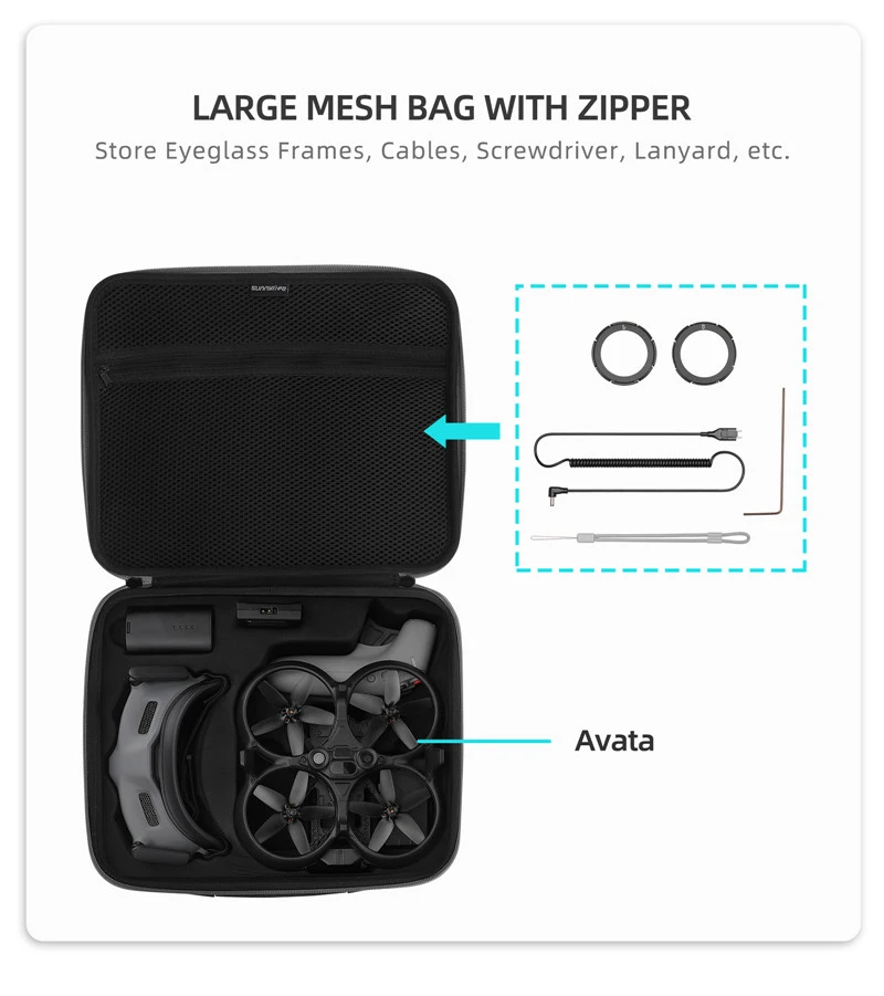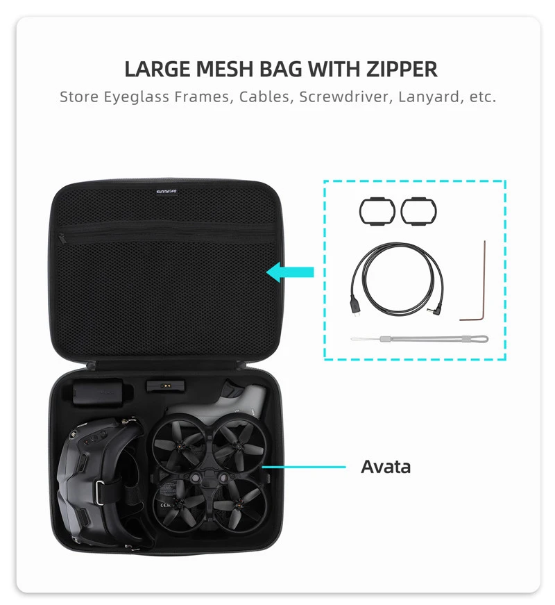 4. Мягкий Средний разделительный слой нежная забота о вашей Avata. Большой эластичный сетчатый мешок с молнией: Лопасти пропеллера, зажим для лопасти, кабель для передачи данных, крышка камеры, фильтр, джойстик, ремень контроллера и небольшие аксессуары.