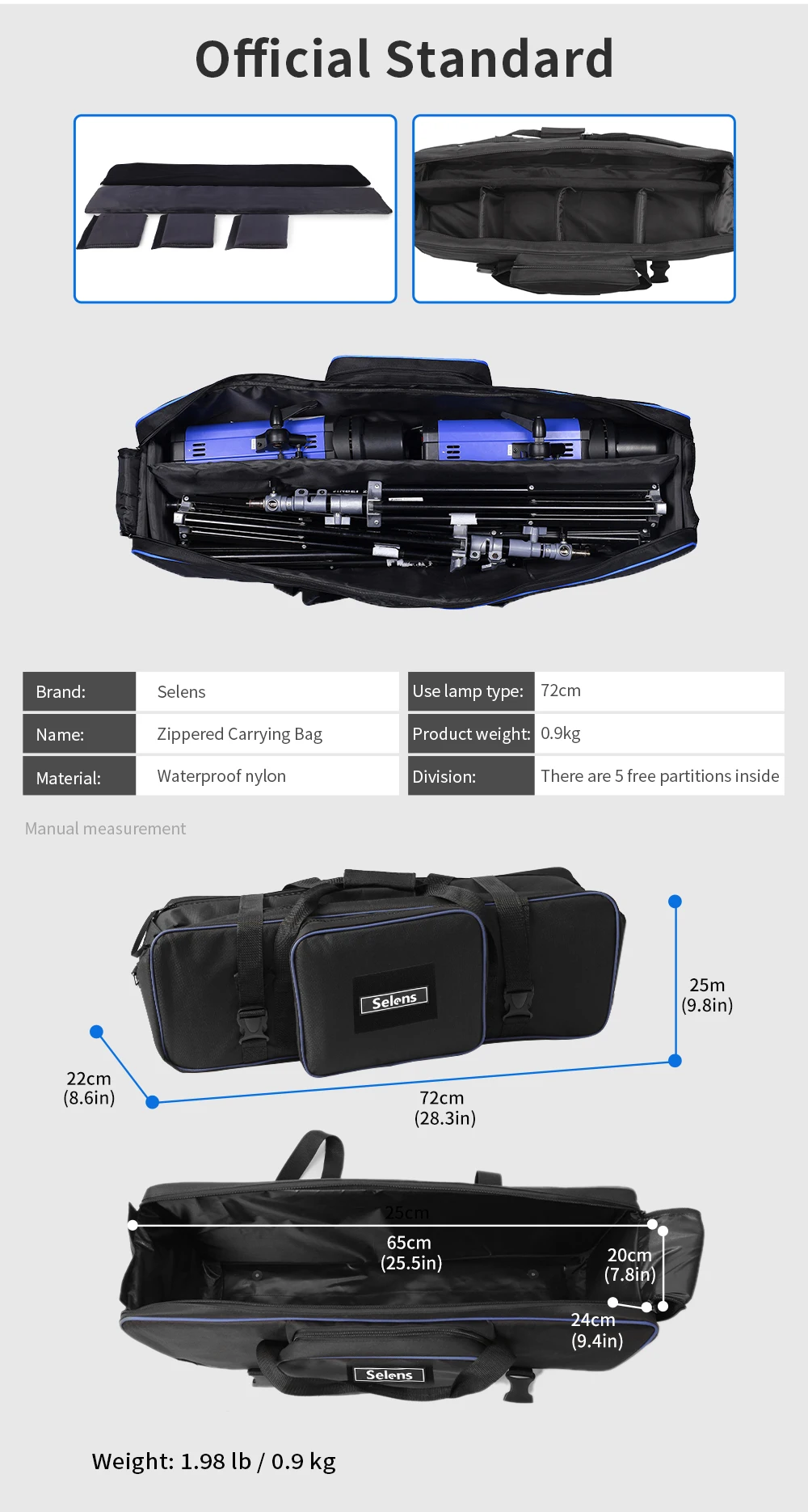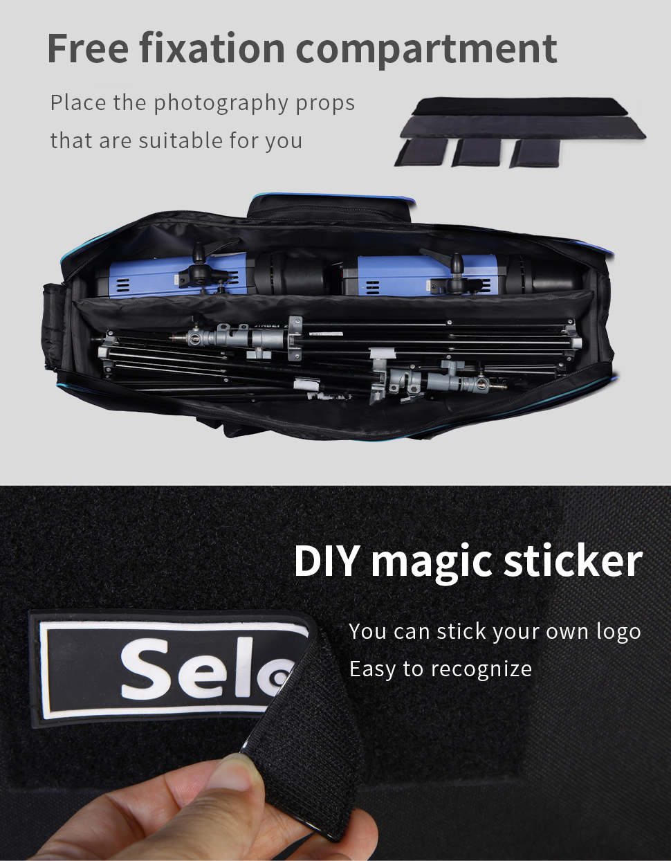 • Эта сумка для переноски с комплектом освещения хорошо разработана для студийного фотографа. Прочная нейлоновая сумка для переноски хорошо защищает ваше осветительное оборудование, когда вы идете.