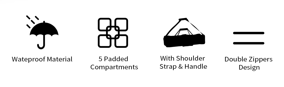 • Его размер подходит для большинства комплекта освещения, внутренние пять отдельных нейлоновых пространств будут отделять световые стойки и обеспечивать, чтобы осветительное оборудование не царапалось друг другом, более безопасный способ защиты световых стоек.