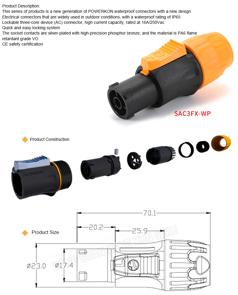 Недавно Разработанный разъем питания Powerkon нового поколения IP65 Водонепроницаемый подходит для подключения источника питания светодиодного дисплея, компьютерных фонарей, фотооборудования, активных динамиков, медицинского оборудования и другого оборудования.