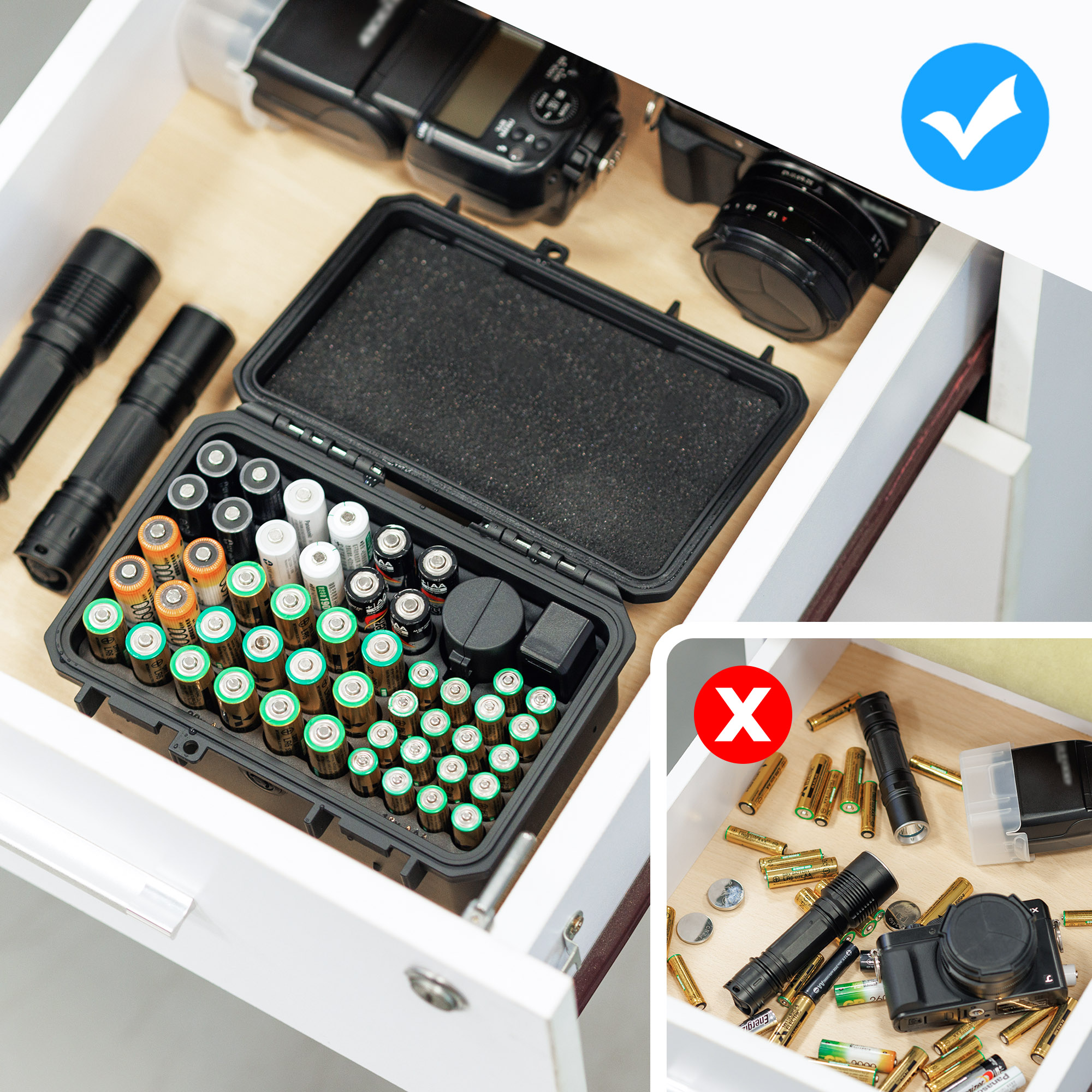 Может хранить 30 батареек AA, 18 батареек AAA и 10 батареек для монет.