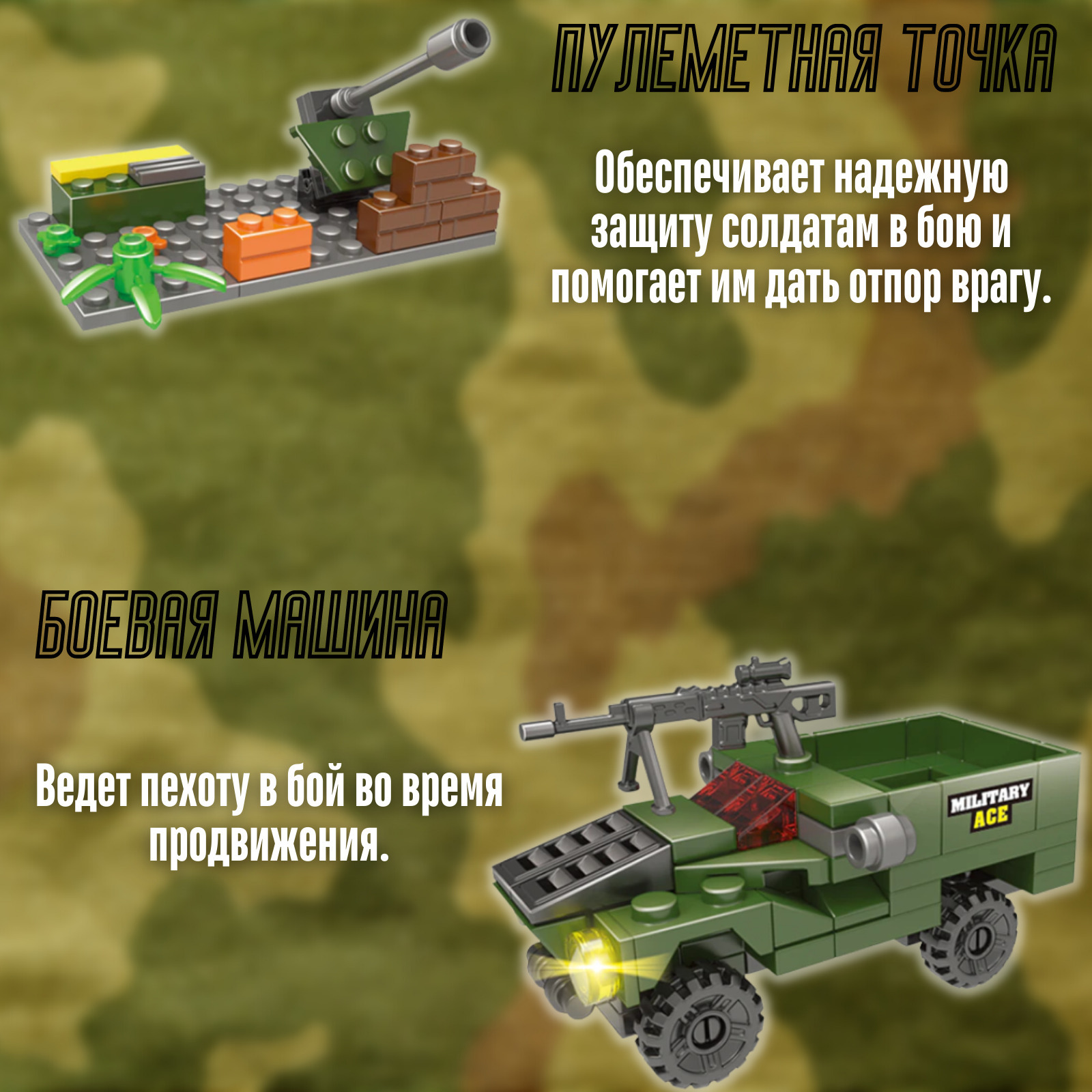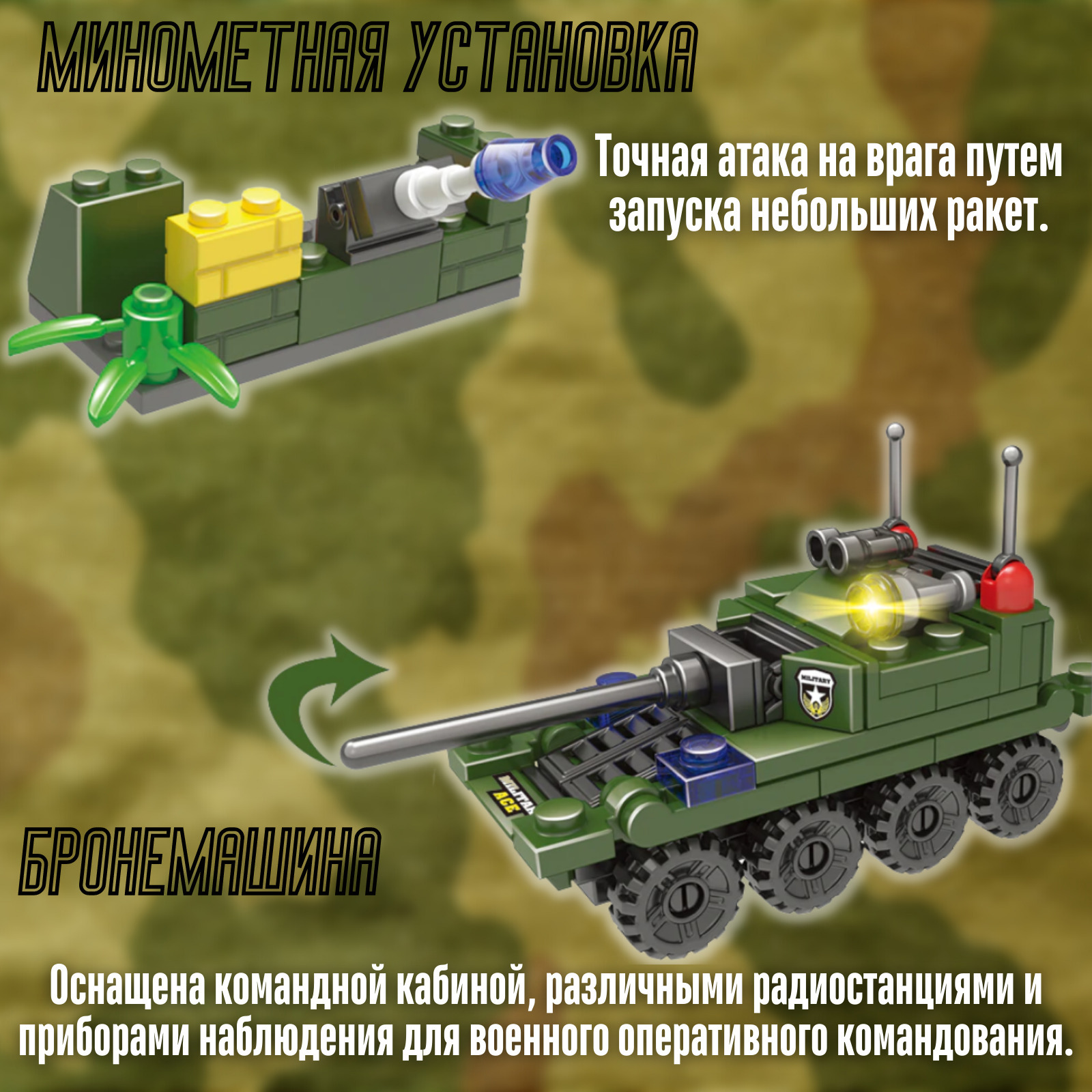 Описание: Военная боевая машина c ракетной установкой понравится всем любителям военной техники. С боевыми машинами можно разыграть самые разнообразные игровые сценарии, ведь в комплекте с ними идет экипаж из 8-х солдатиков с полным боевым обмундированием. Детали в конструкторе легко и плотно соединяются между собой. Совместим с моделями конструкторов мировых производителей. В наборе 785 элементов.