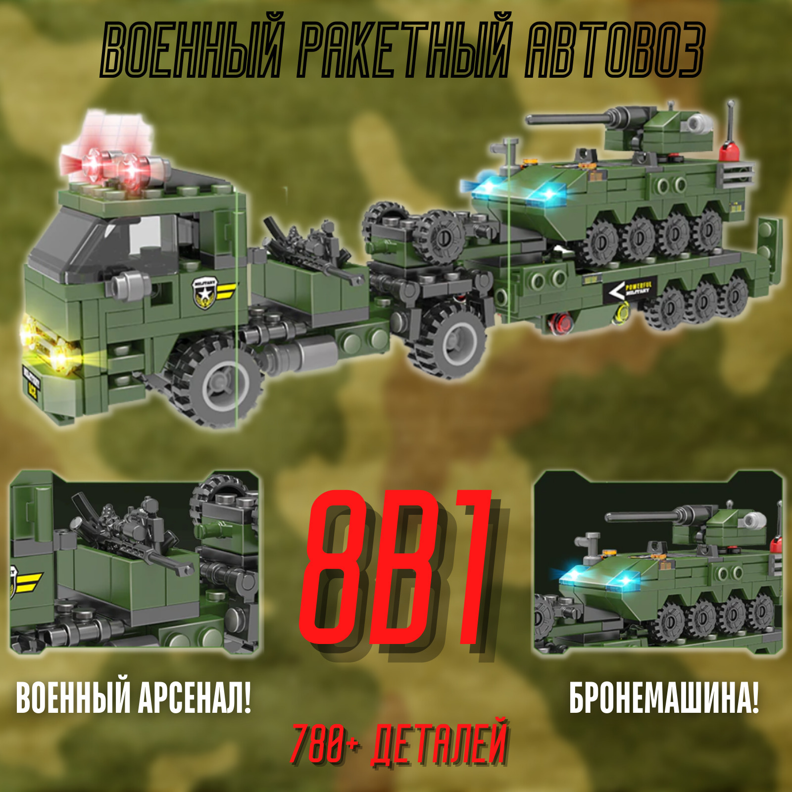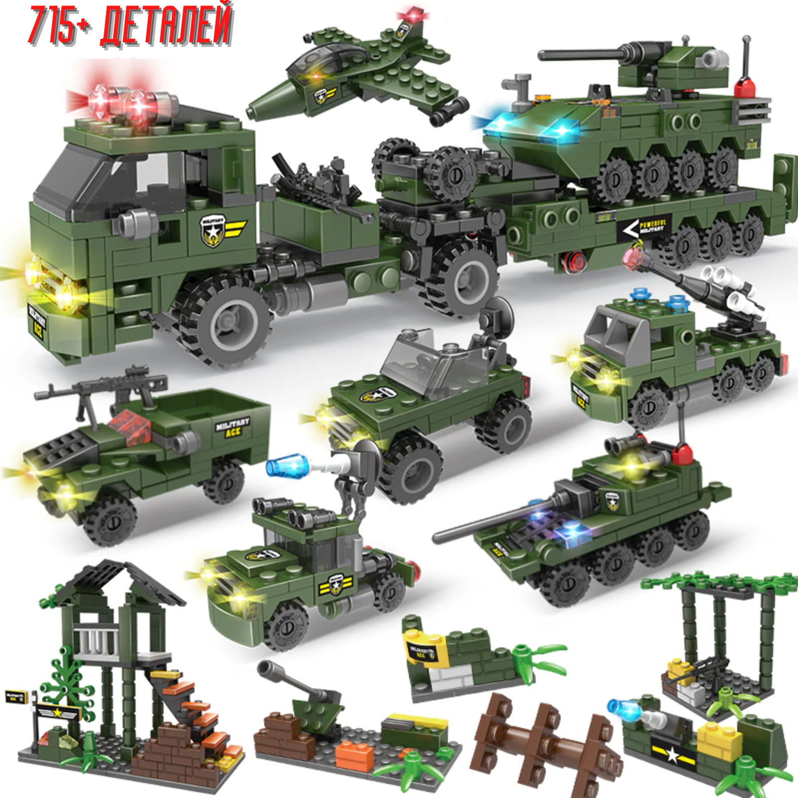 Военный Конструктор 8 В 1 715+ деталей "Военный транспортер" / Конструктор для мальчиков / армия, военная техника, вертолет, штурмовой автомобиль, машинка, бронетехника, джип / Военный / Полиция конструктор
