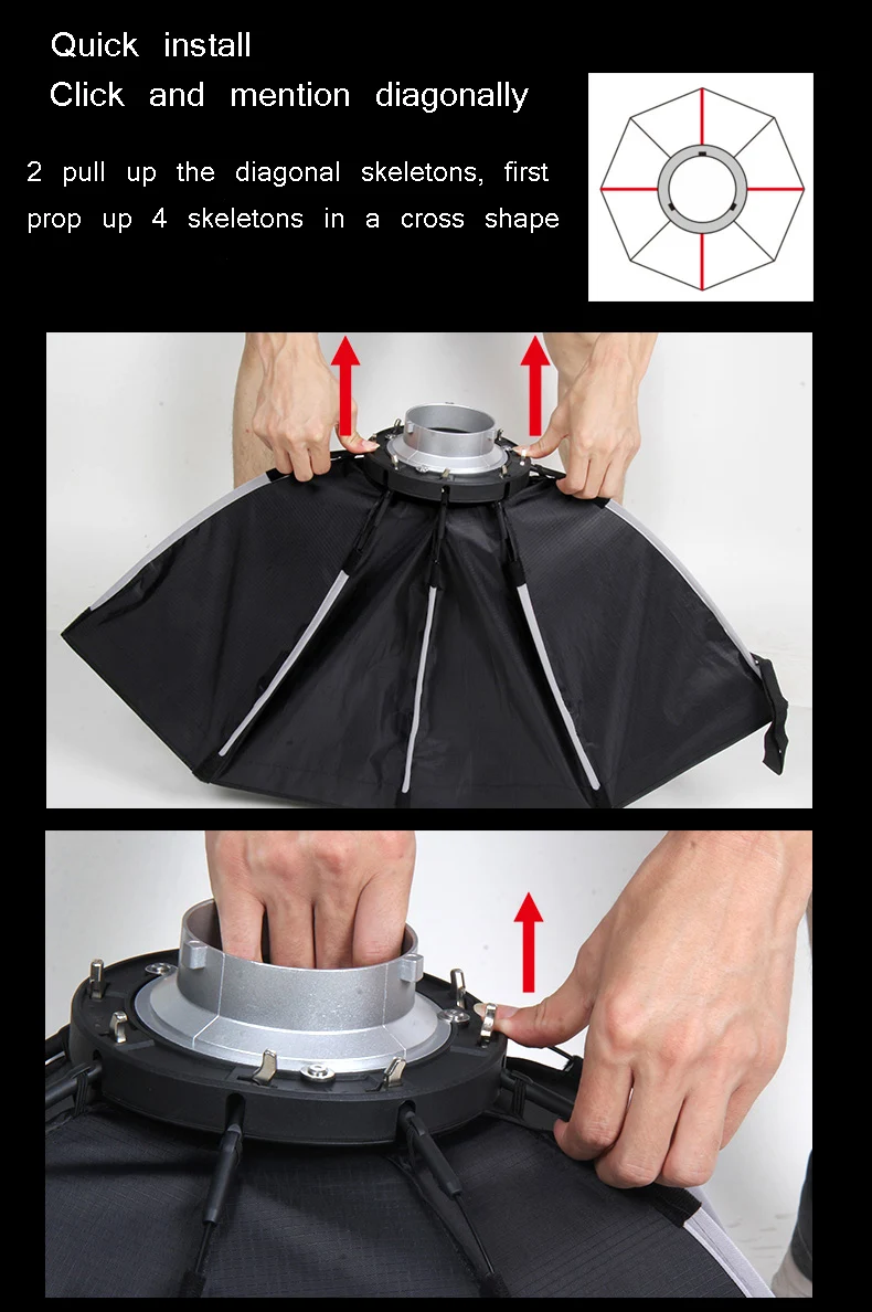 1. Внутри с отражающим серебром и передним полупрозрачным диффузором, отлично подходит для вспышки Speedlite, монолитного, стробоскопа или ведомого.