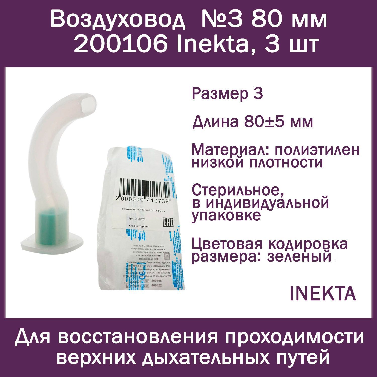 Описание: Воздуховод Размер 3 Предназначен для восстановления и поддержания проходимости верхних дыхательных путей во время реанимационных мероприятий. Изделие длиной 80±5 мм представляет собой анатомически изогнутую трубку из полиэтилена низкой плотности. Имеет прикусной вкладыш из полиэтилена высокой плотности с цветовой кодировкой размера (зеленый). Изделие стерильное, для однократного применения, в индивидуальной упаковке. Срок хранения – 5 лет.
