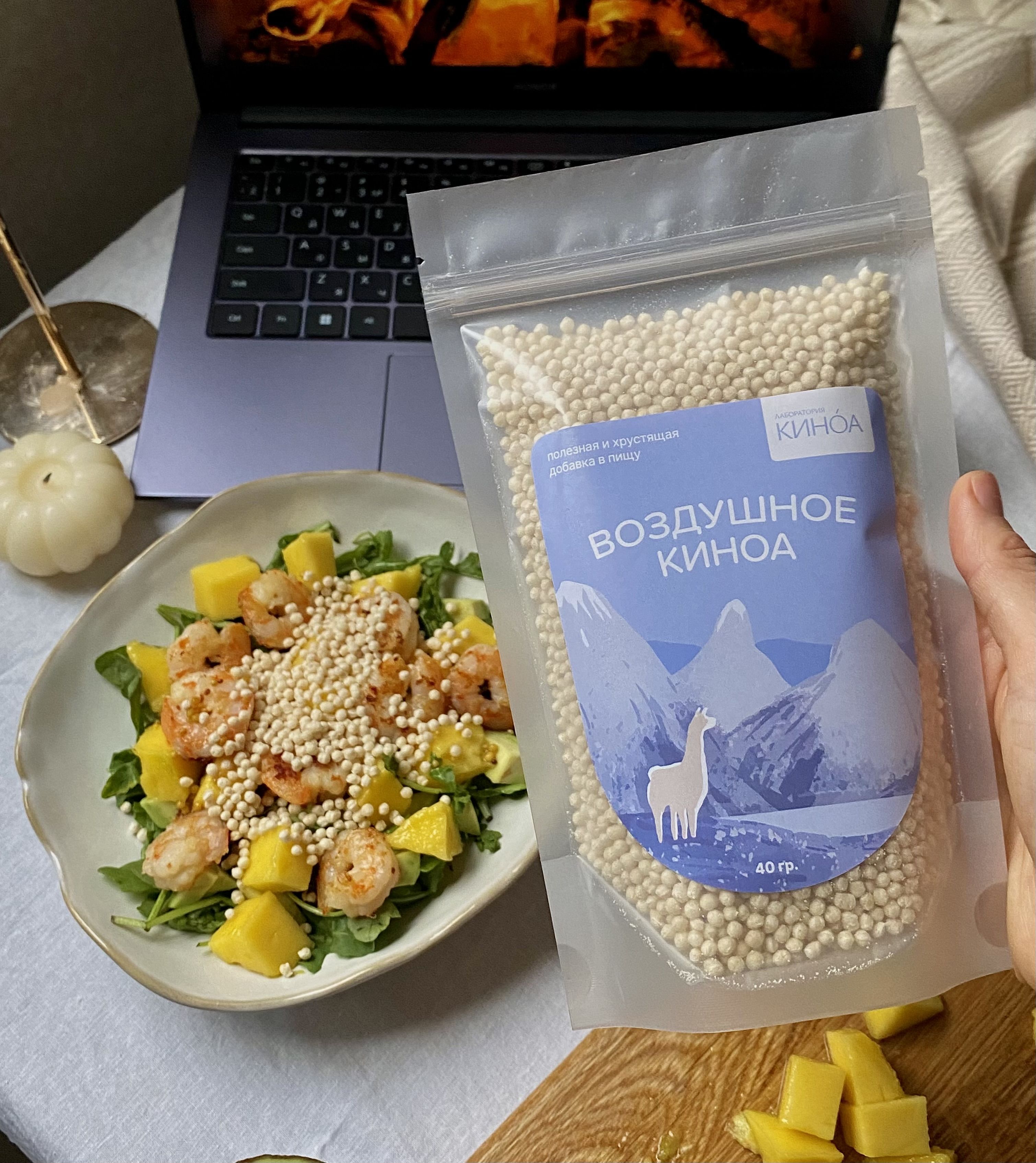 Это уже готовый продукт к употреблению и его вкусно есть прямо из пачки, а также воздушное киноа может служить дополнением или основным ингредиентом для множества блюд! От простых завтраков до сложных кондитерских изделий.