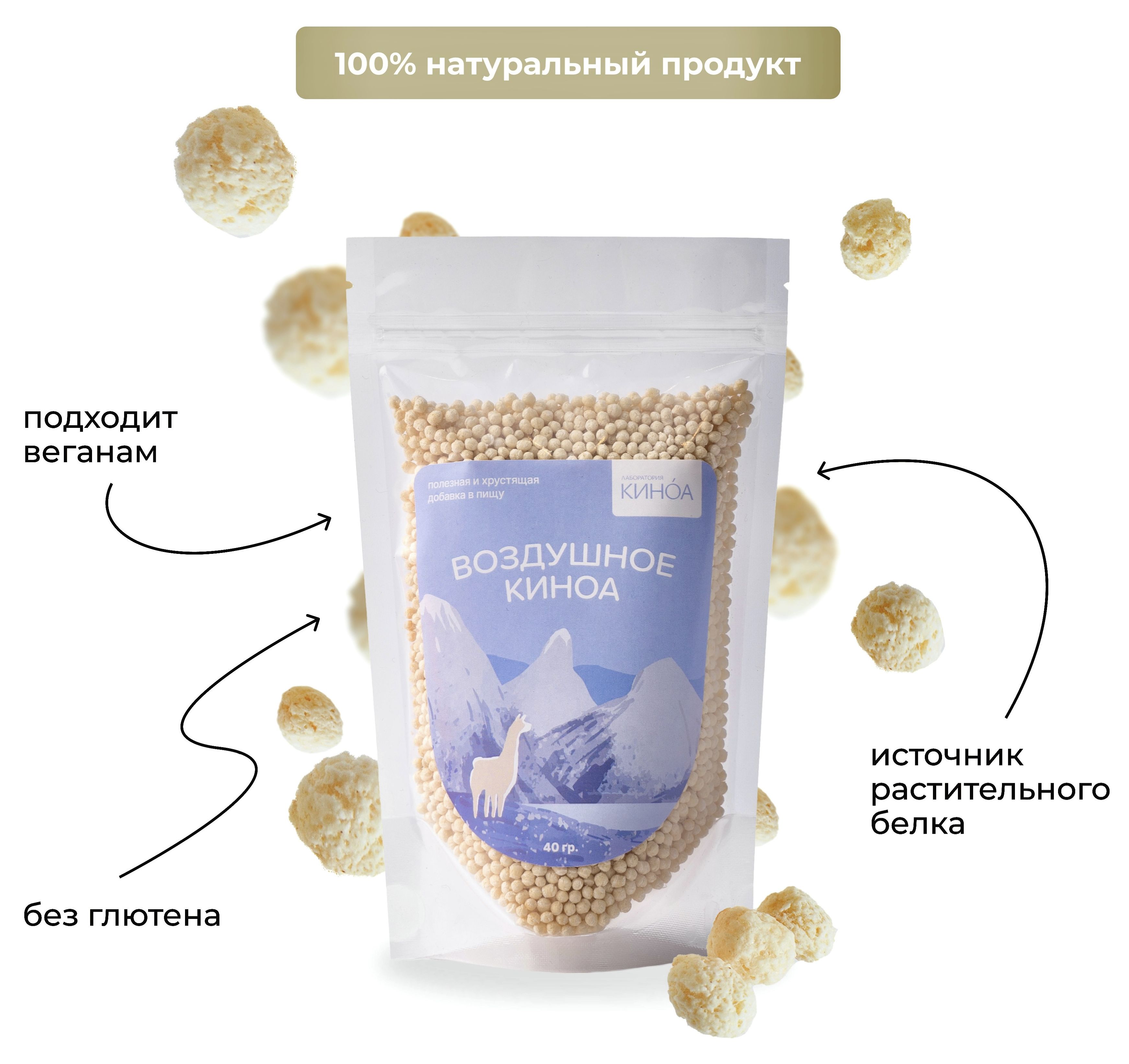 Заботьтесь о своем здоровье, добавляя воздушное киноа в любой из ваших приемов пищи в течение дня!Разнообразие рационаВоздушное киноа имеет мягкий ореховый вкус и легкую хрустящую текстуру и является растительным источником белка, пищевых волокон и железа.