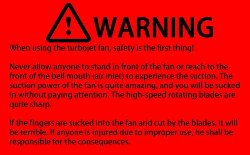 4. Turbo Jet Fan оснащен высокоэнергетическим двигателем с высокими оборотами, что означает, что длительное и непрерывное использование продукта может привести к выделению чрезмерного тепла. Мы настоятельно рекомендуем использовать его в течение более коротких периодов и избегать перегрева. В среднем он обычно обеспечивает примерно 10-15 минут использования при полной нагрузке.