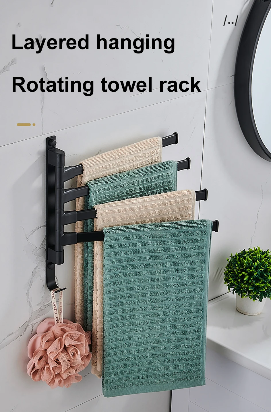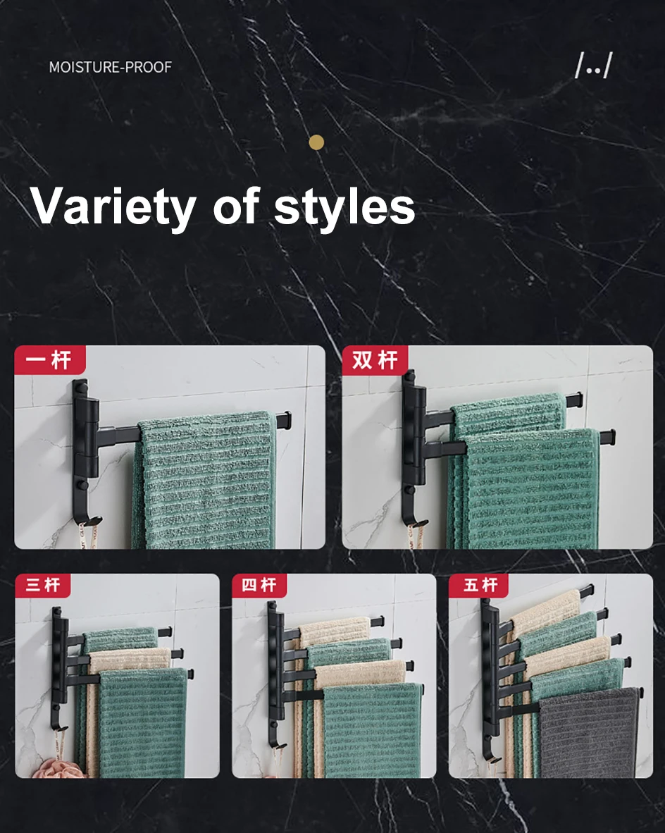 【Вращающаяся Поворотная рукоятка】 эта Поворотная вешалка для полотенец оснащена поворотными рычагами, которые могут свободно вращаться 180 градусов, чтобы избежать соприкосновения влажных и сухих полотенец друг с другом.
