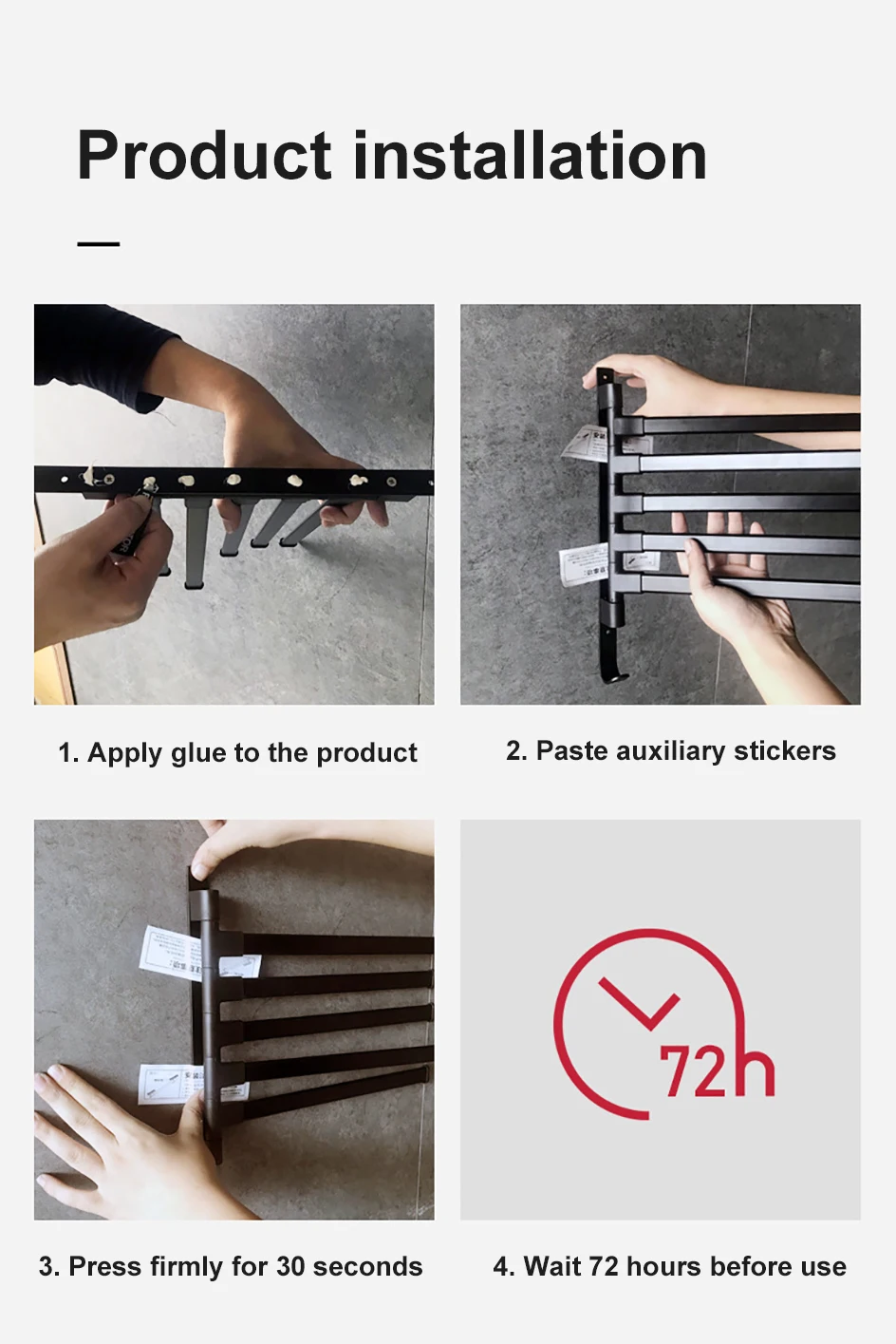 【Меры предосторожности 】 обратите внимание, что держатель можно установить на плитку, мрамор, гранит, закаленное стекло, гладкие деревянные стены и гладкий твердый металл. Однако не рекомендуется использовать для неровных или шероховатых поверхностей, таких как окрашенные стены, обои, бетонные стены или стены из извести.