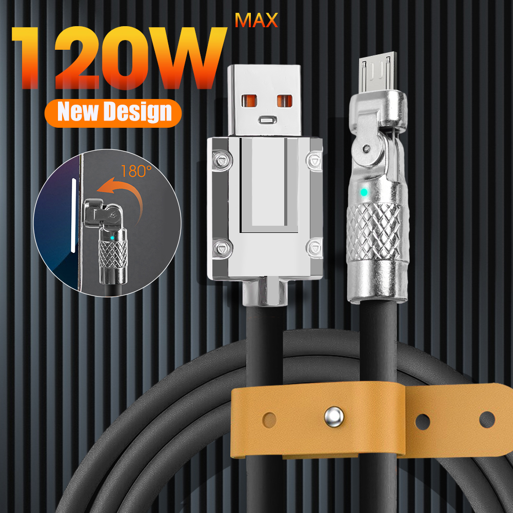 Вращающийся на 180 градусов кабель Micro USB в оплетке из цинкового сплава для быстрой зарядки Android, iPhone, Samsung, 120 Вт, 5 А
