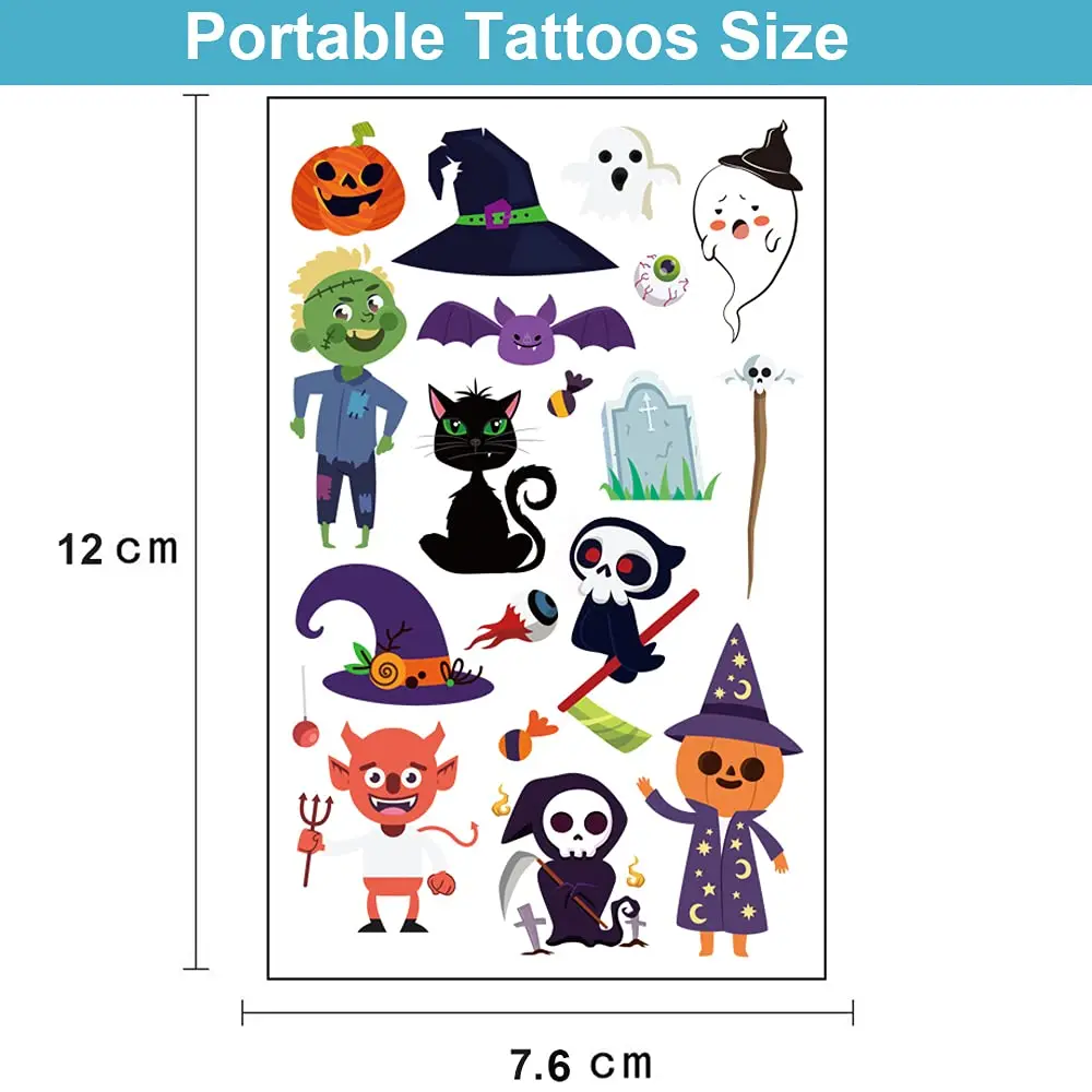 【Татуировки на Хэллоуин Мультяшный дизайн】-Другой стиль Татуировки на Хэллоуин Наклейки Узор для детей Мальчики Девочки Женщины Мужчины. Тыквы, призраки, надгробия, замки, Черный кот, шляпы волшебника, пауки, рука Призрака и суп ведьмы, которые могут добавить интересную атмосферу Хэллоуина. Будьте уникальны для вечеринки и помогите своим детям поделиться этими татуировками на Хэллоуин со своими друзьями. Вы можете нанести их на свое тело или некоторые гладкие предметы, например стекло, бумагу, подарочную коробку, корпус мобильного телефона, автомобиль.