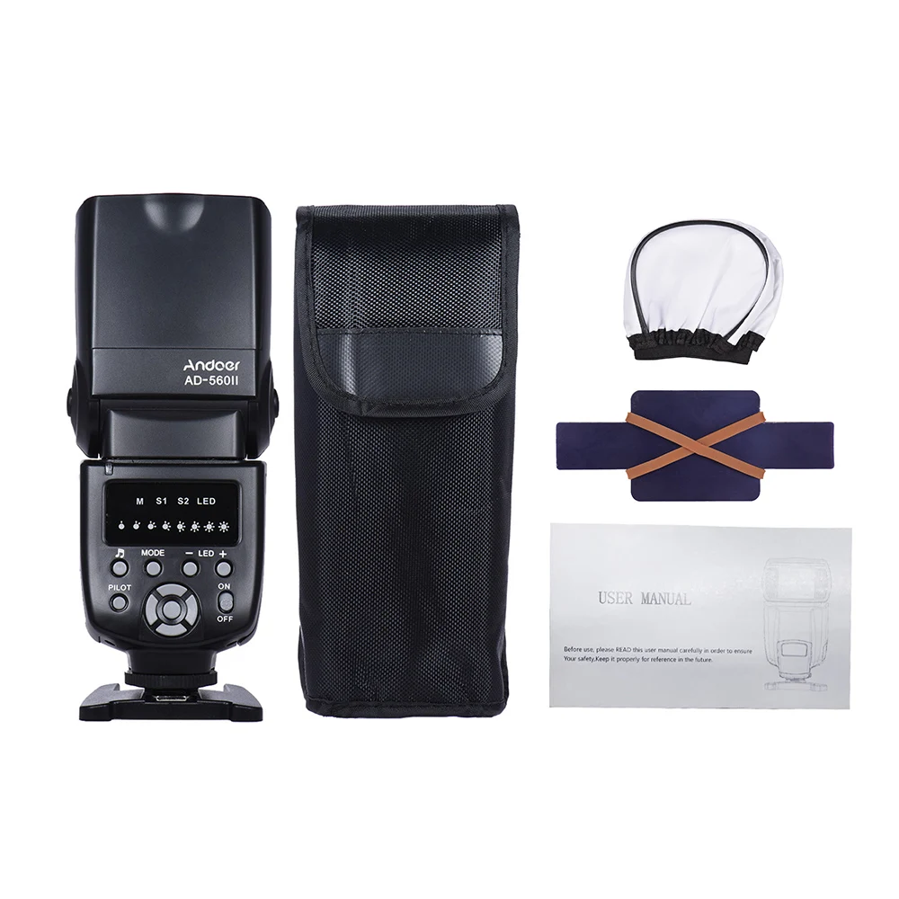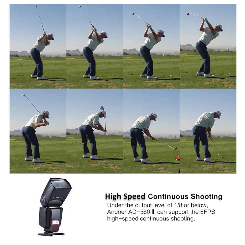Высокоскоростная непрерывная съемка: при уровне выхода 1/8 или ниже Andoer AD-560 Ⅱ может поддерживать высокоскоростную непрерывную съемку 8 кадров в секунду; Экономия автоматической настройки: AD-560 Ⅱ может автоматически сохранять настройки тока.