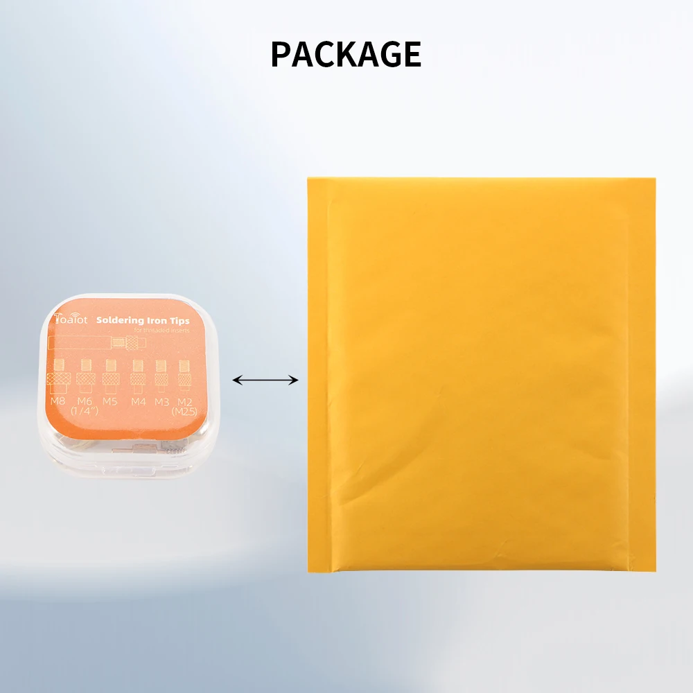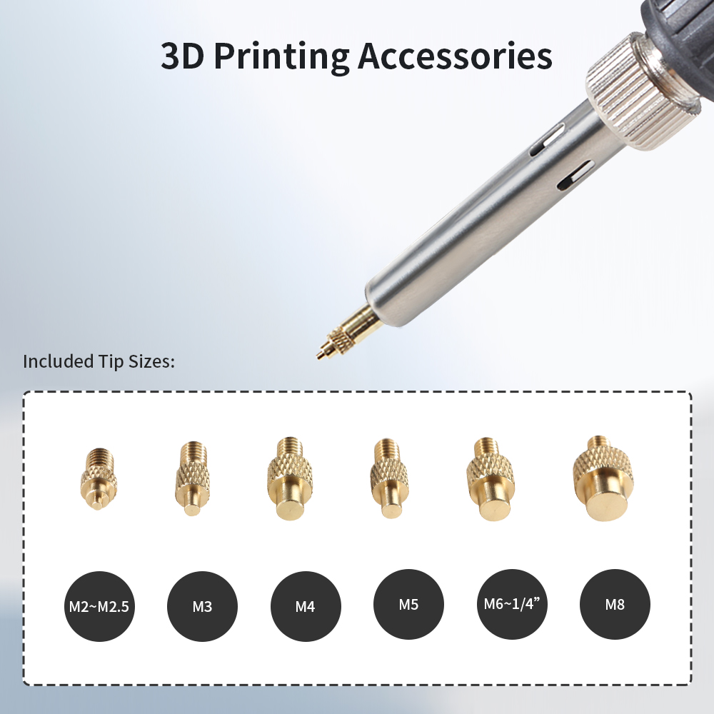 2. Сфера применения: взаимозаменяема со стандартными жала паяльника общего назначения 936, используемыми для M2 (M2, 5 общий), M3, M4, M5, M6 (1/4 "), m8 и другие гайки или вставки горячего расплава, часто используемые в 3D-принтере, печатают гайки из меди горячего расплава или гайки имплантатов на пластике.