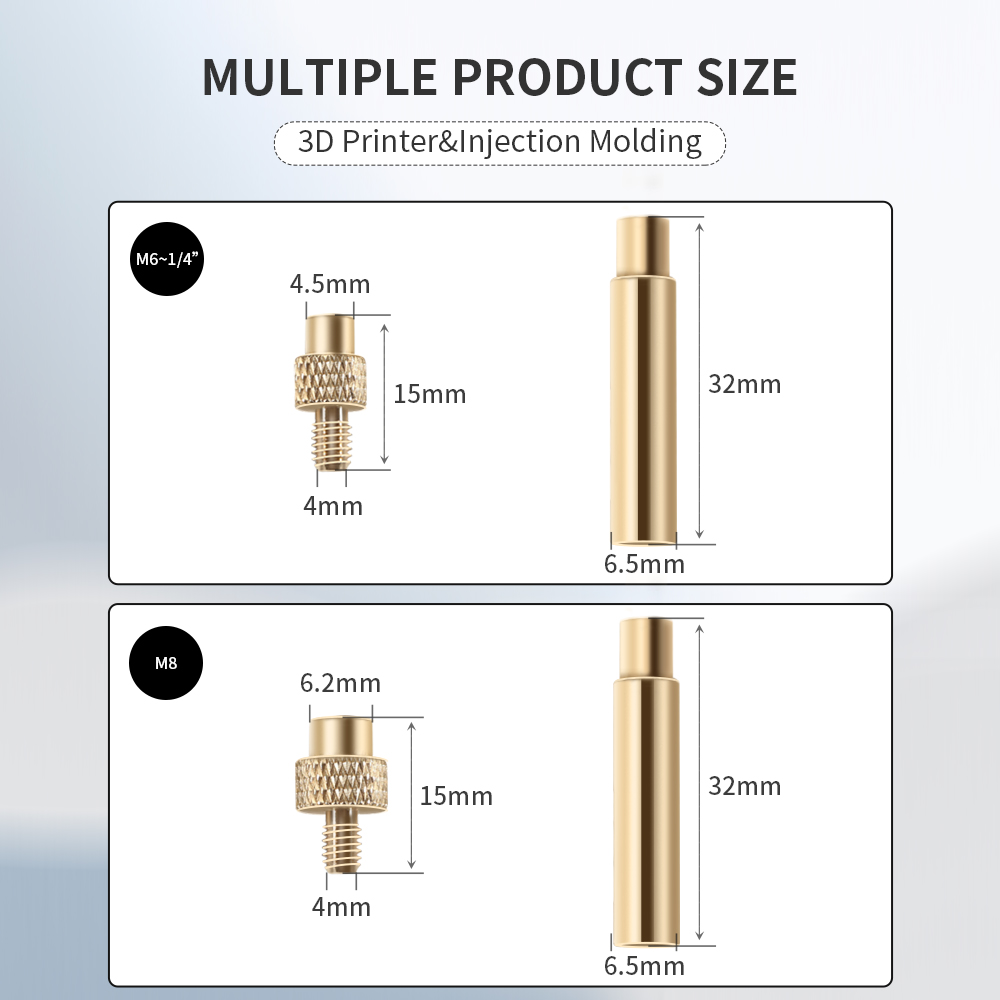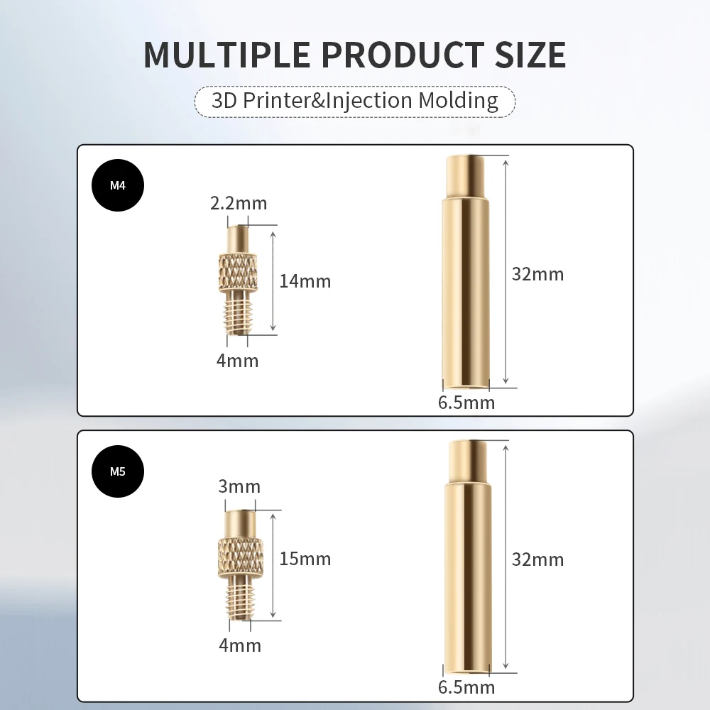 4) Латунный материал, хорошая кондукция жары, контакт конечной грани, предотвращает гайку от перекоса, и удобен и быстр для того чтобы врезать гайку в пластиковую часть