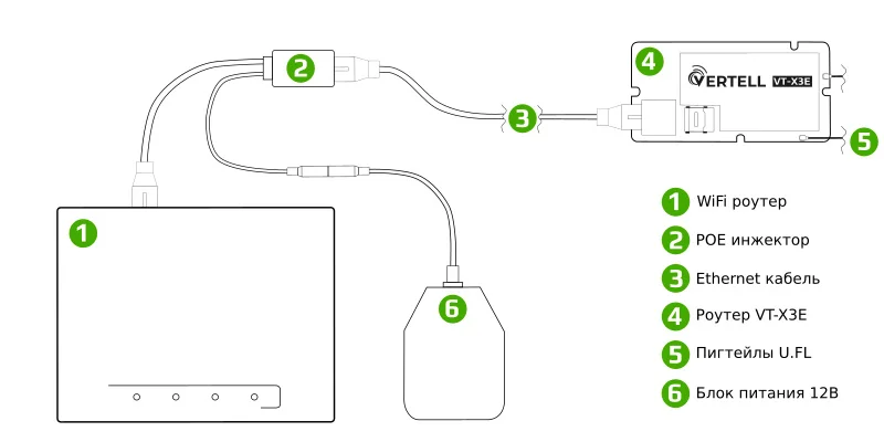 Подключение роутера Vertell VT-X3E EC-25EU к коммутатору или домашнему роутеру производится патч-кордом из витой пары через пассивный POE-инжектор совместно с подачей напряжения на роутер с помощью блока питания 12 - 15 V. При больших длинах патч-корда (свыше 40 м) рекомендуется использовать блоки питания с напряжением 15 V. Для стабильной работы рекомендуется использовать витую пару из медного кабеля с сечением жилы AWG 24. Расшивка разъема витой пары допускается по стандарту T568A и T568В (прямой обжим).