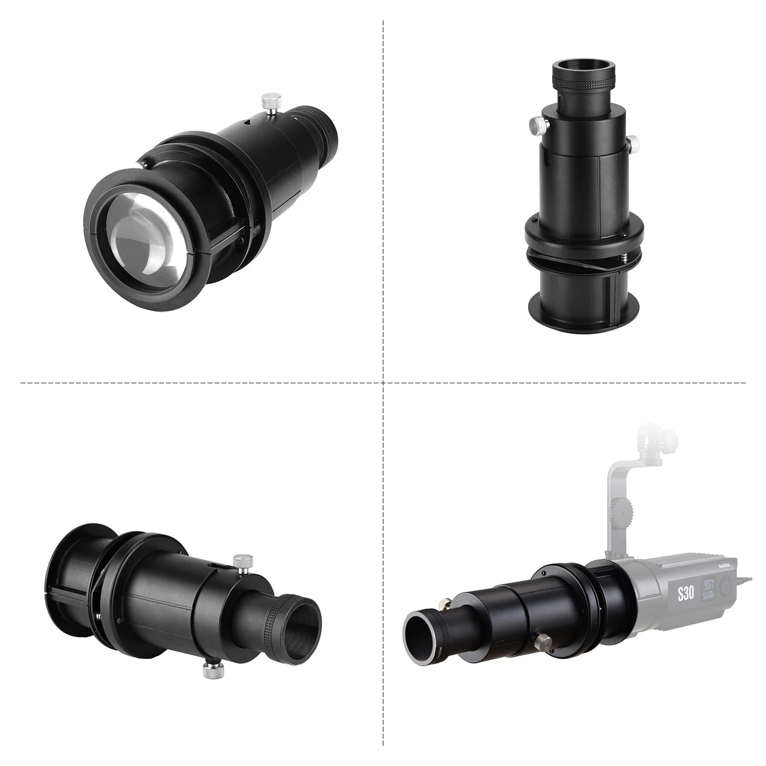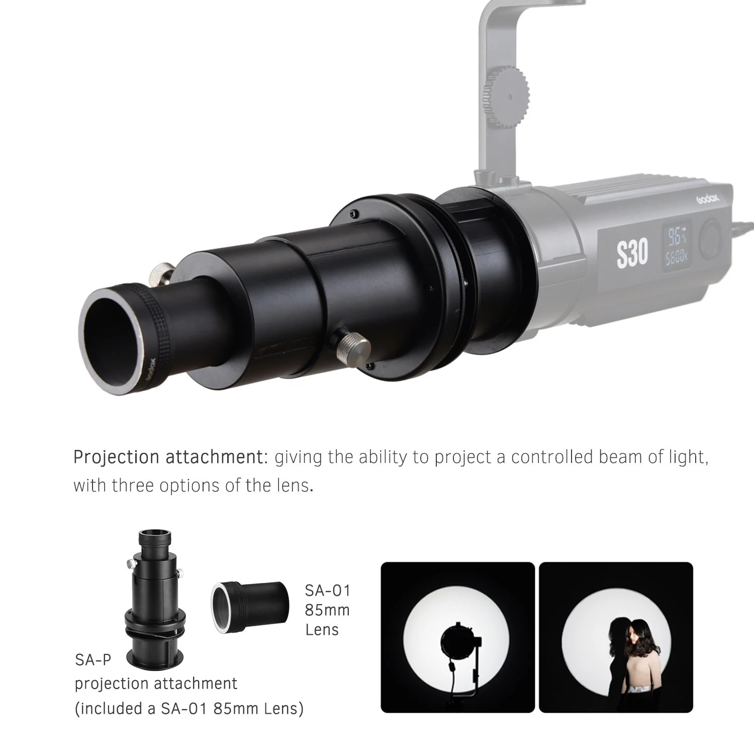 Проекционное крепление предназначено для Godox S30 светодиодный светильник для видео. Оснащен SA-01 объективом 85 мм. Давая возможность проектировать контролируемый светильник. Легкий и портативный, удобно носить с собой.