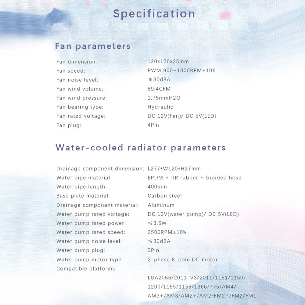 Номинальное напряжение водяного насоса: 12 В постоянного тока (водяной насос)/5 В постоянного тока (светодиодный)