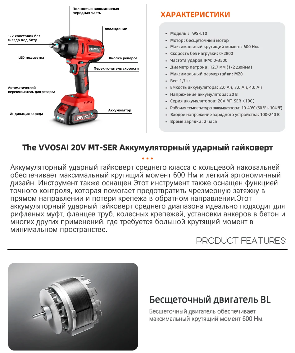 VVOSAI 20V Электрический ударный ключ 600н. М бесщеточный ключ перезаряжаемый 1/2 дюймовый литий-ионный аккумулятор для автомобильных шин беспроводной электроинструмент