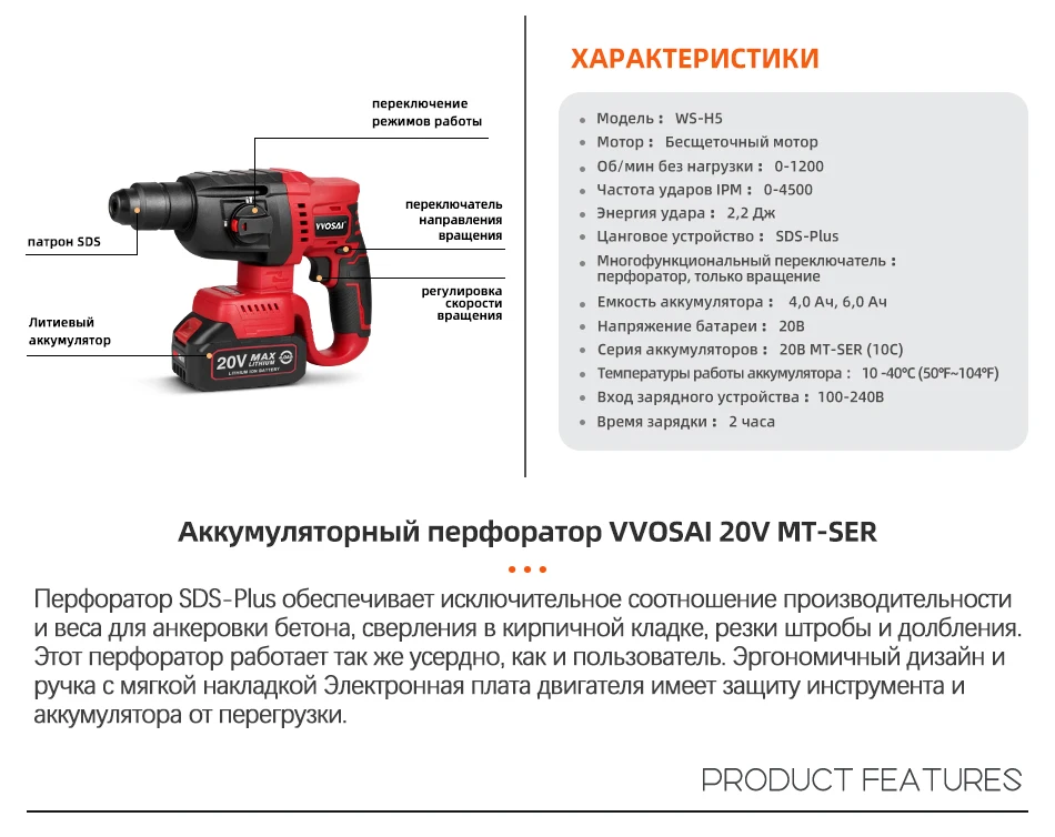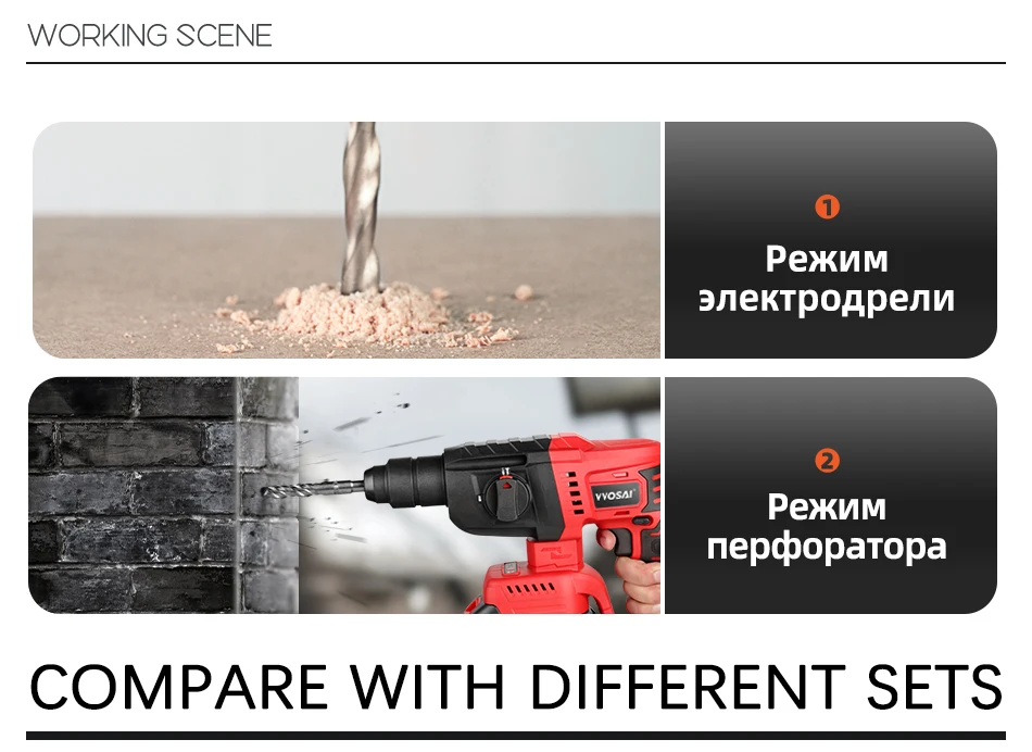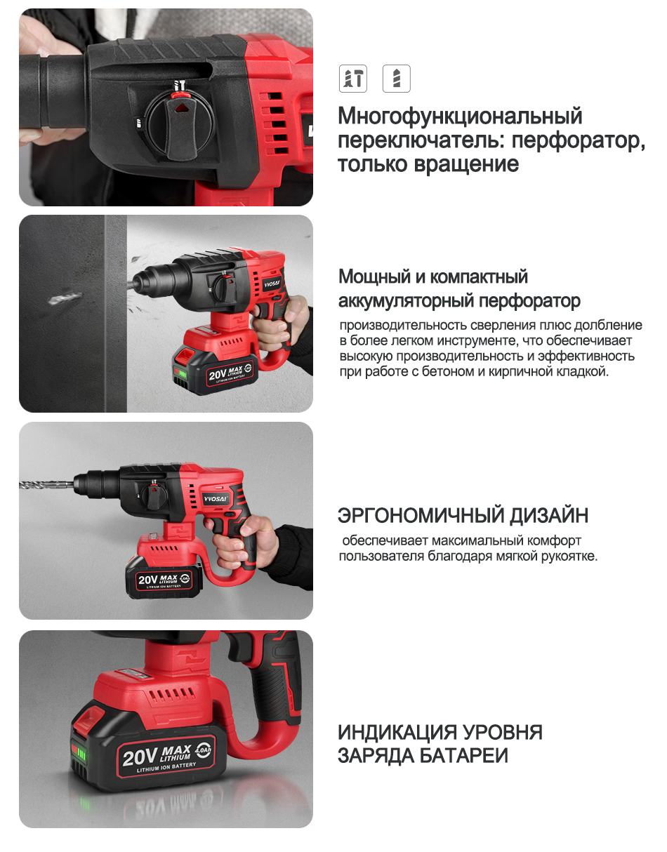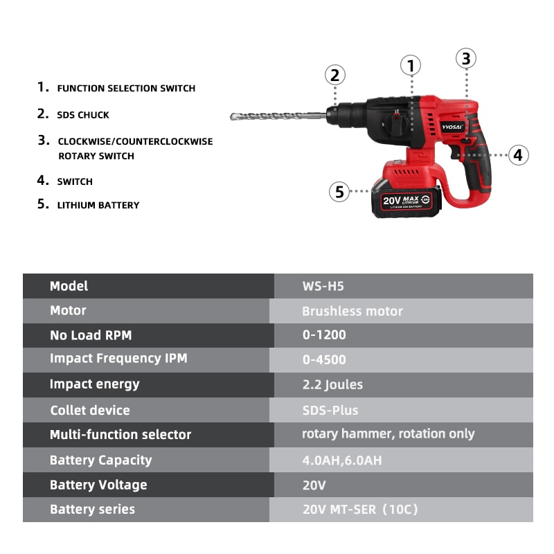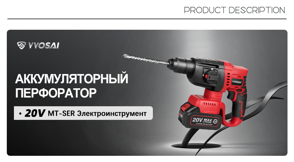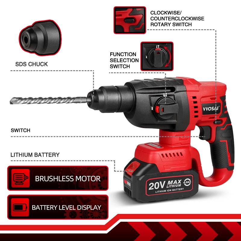 VVOSAI MT-Series 20V бесщеточный электрический молоток 4500 IPM Электрический инструмент роторные молотки перфоратор электроинструмент