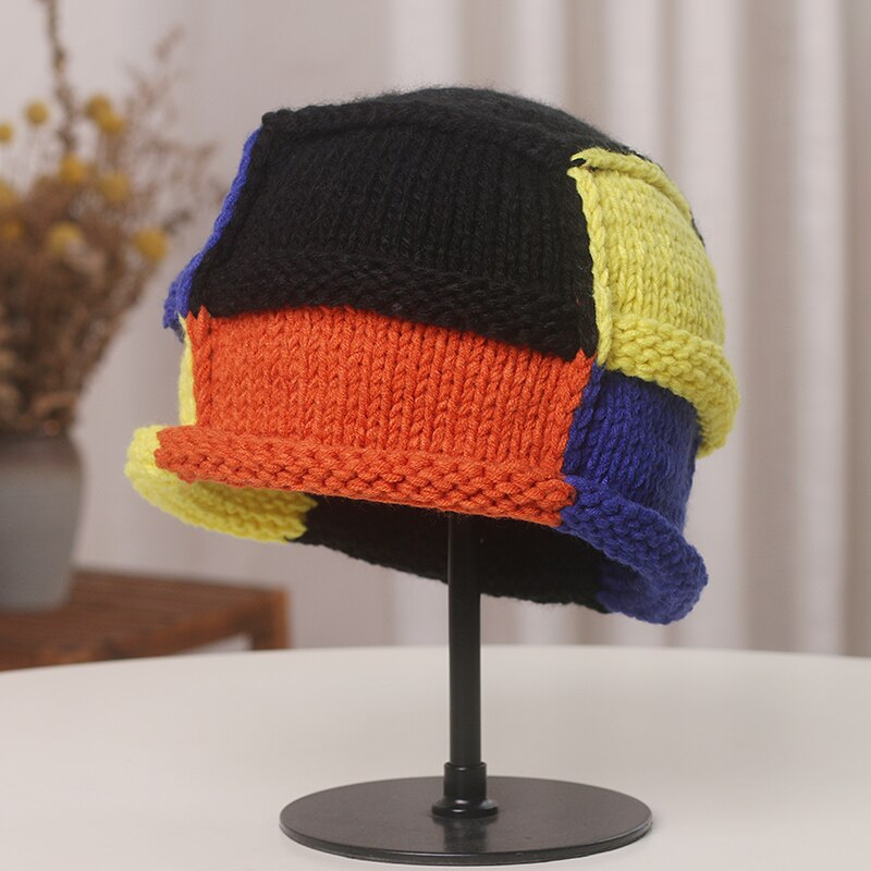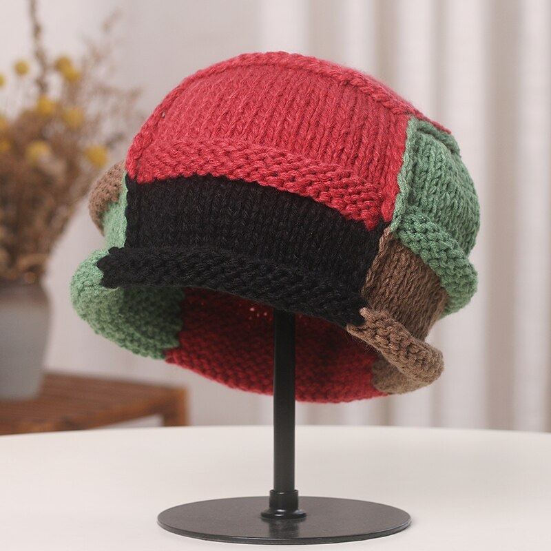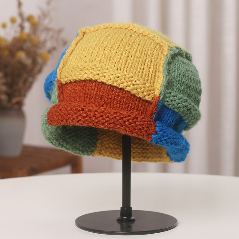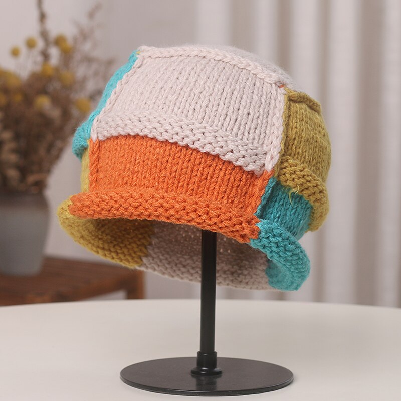 Вязаная Шапка-бини контрастного цвета в японском стиле, кепка ручной работы с защитой вьющихся ушей, осенне-зимние теплые женские шапки