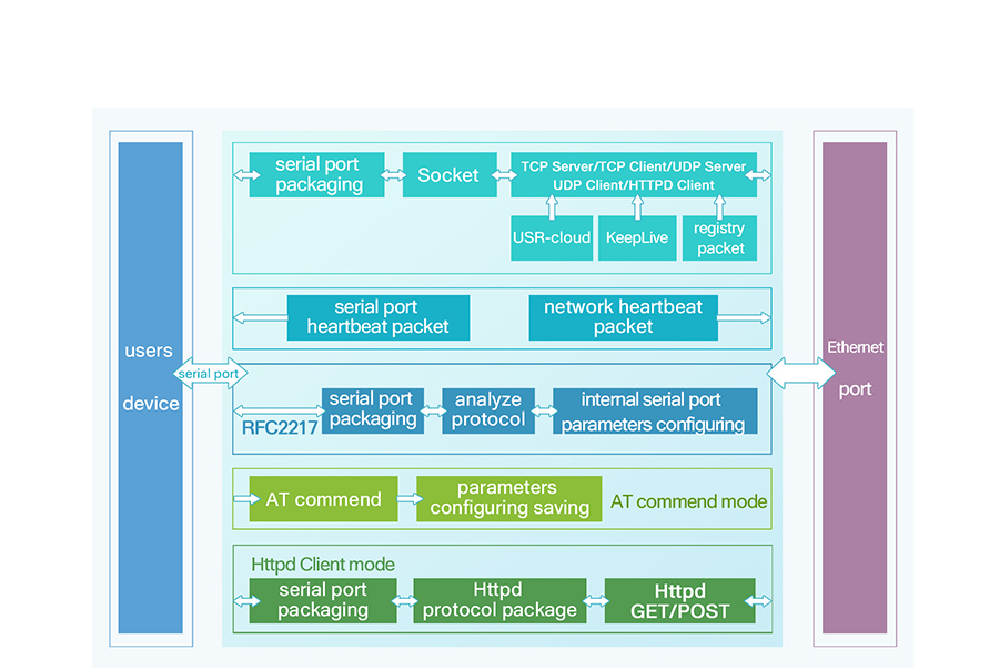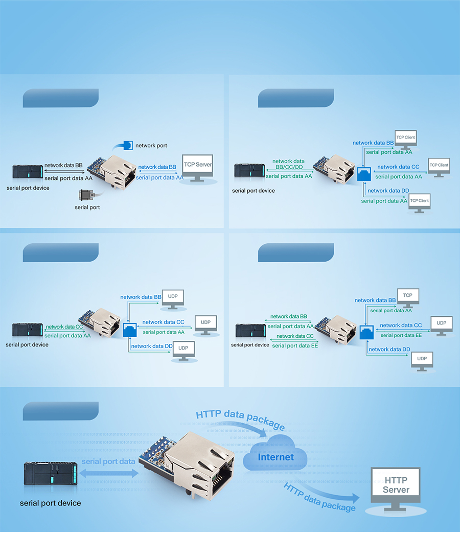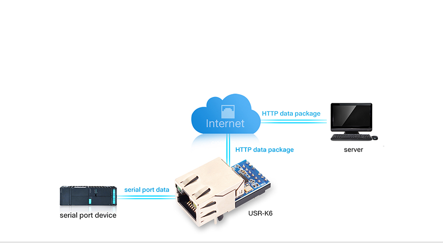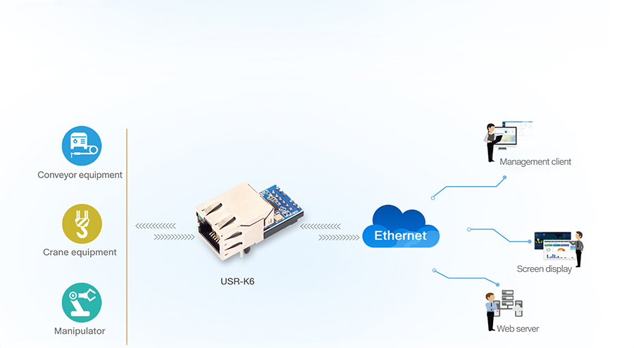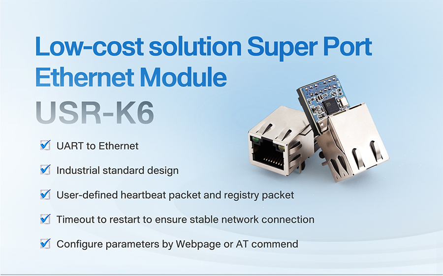 Встроенный модуль Ethernet USR-K6 поддерживает 5 режимов работы, просто настраивается и может реализовать прозрачную передачу данных.