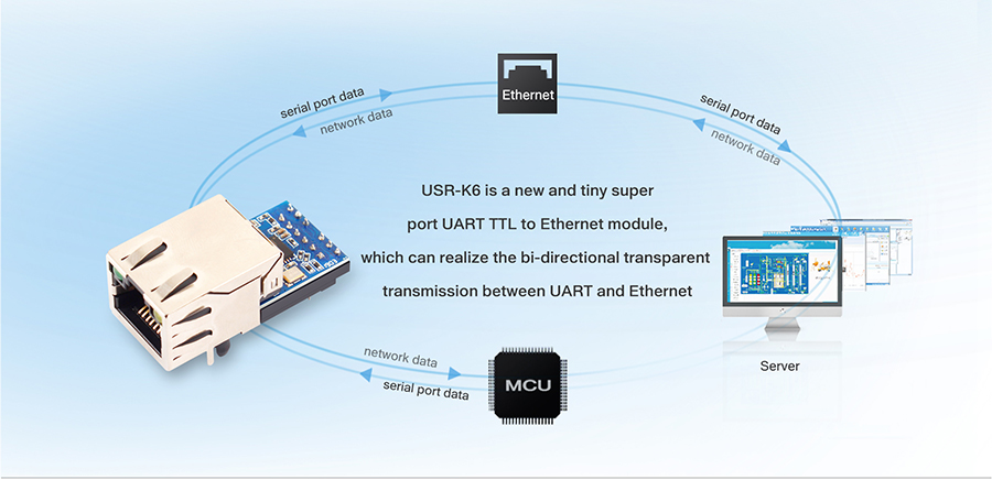 Многие традиционные устройства с последовательным портом не имеют сетевых возможностей. USR-K6 модуль интегрированного стека протоколов TCP/IP