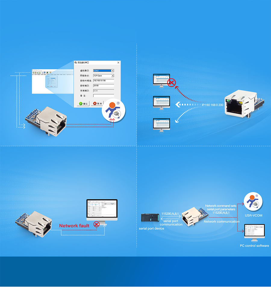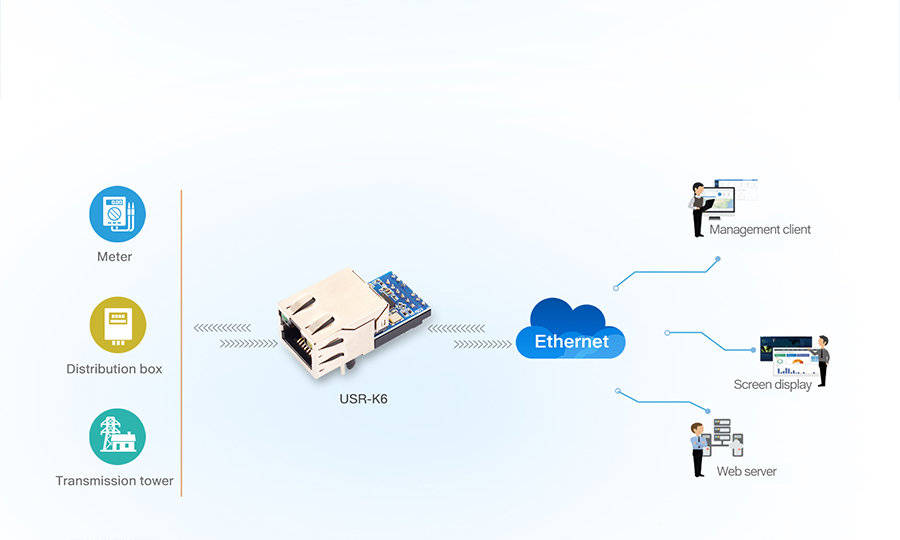 Модуль TTL to Ethernet USR-K6 может быстро реализовать передачу данных между последовательным портом и сетью, что сокращает рабочую силу при исполнении служебных обязанностей.